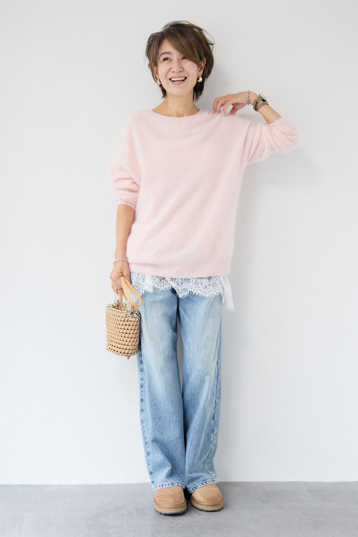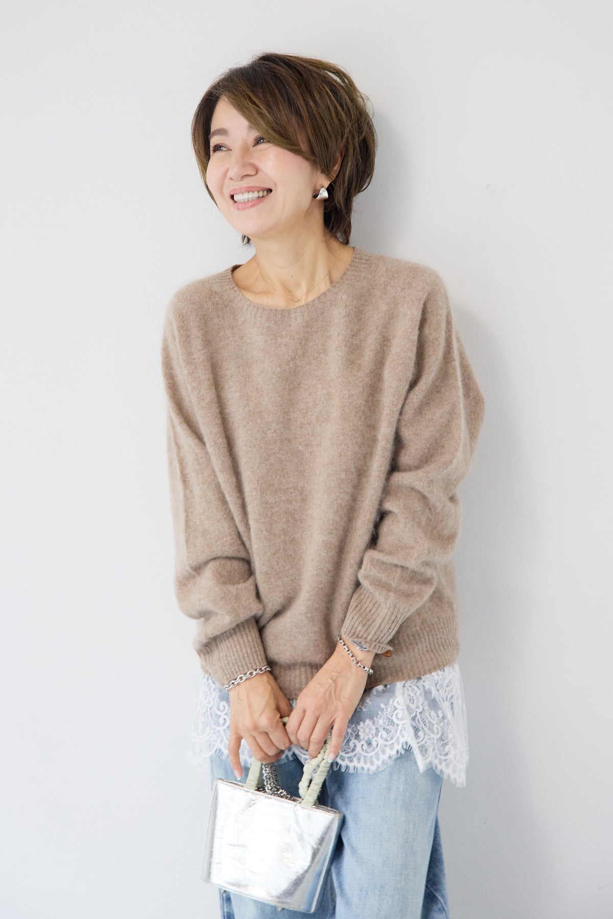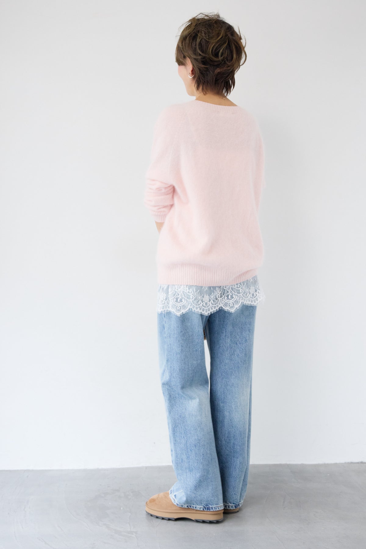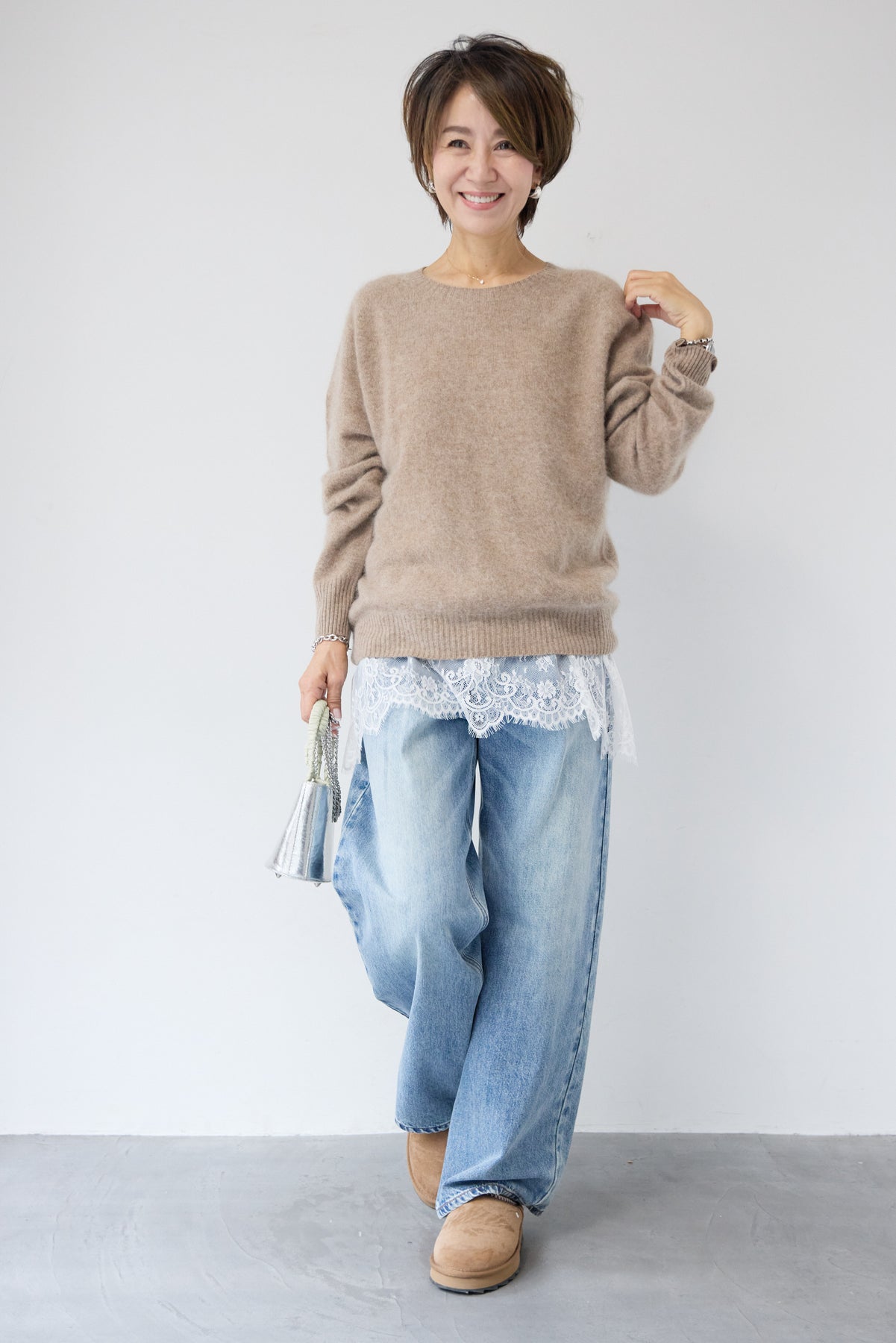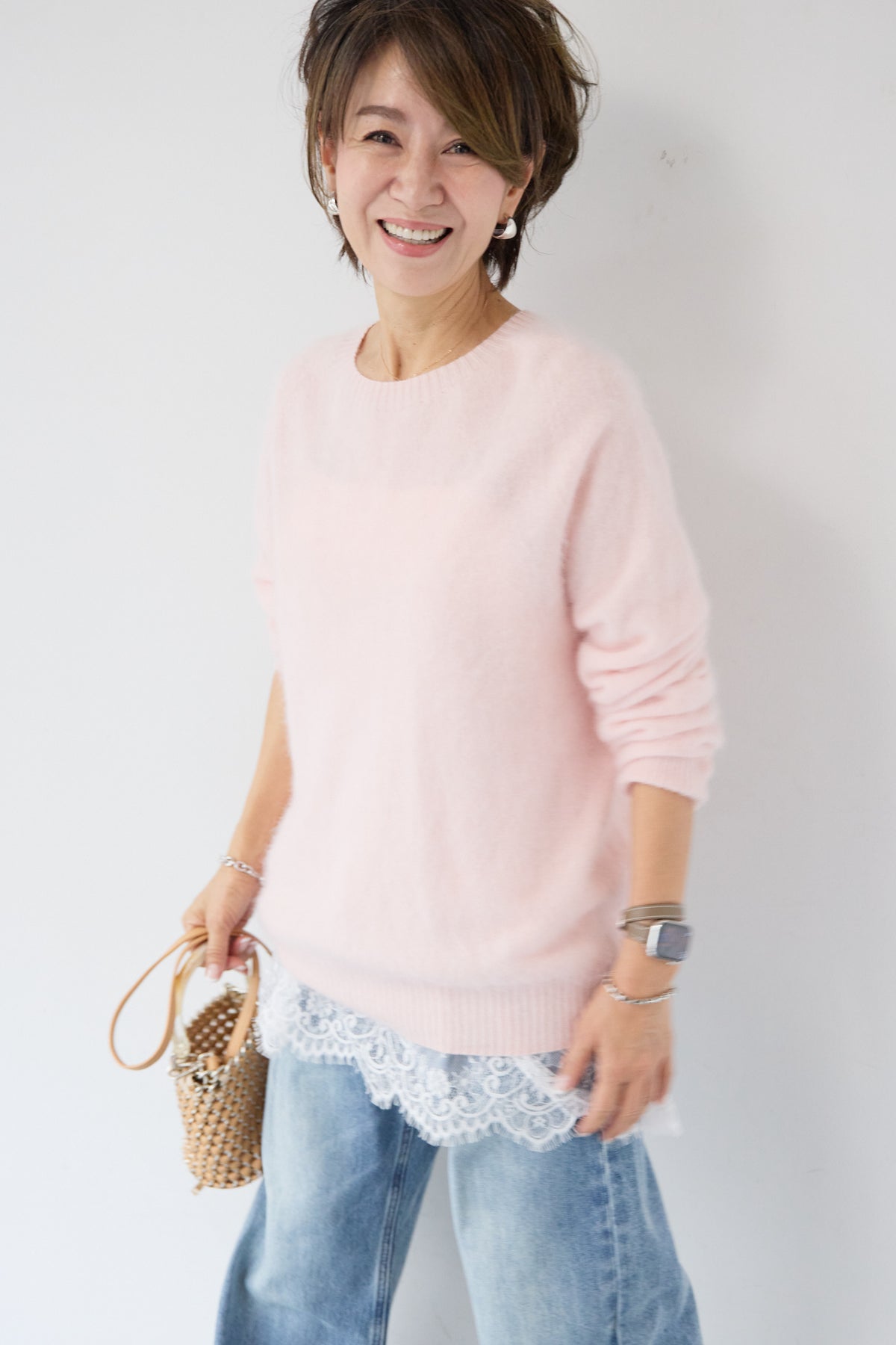 裾には繊細で上品なレースをあしらい、甘さを抑えた大人フェミニンな印象に仕上げています。レース部分は程よい透け感があり、重ね着しても軽やかな見え方が魅力です。