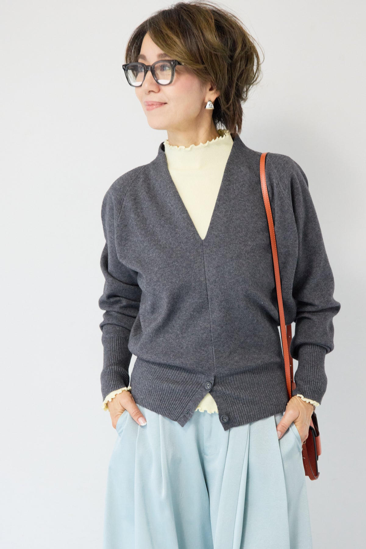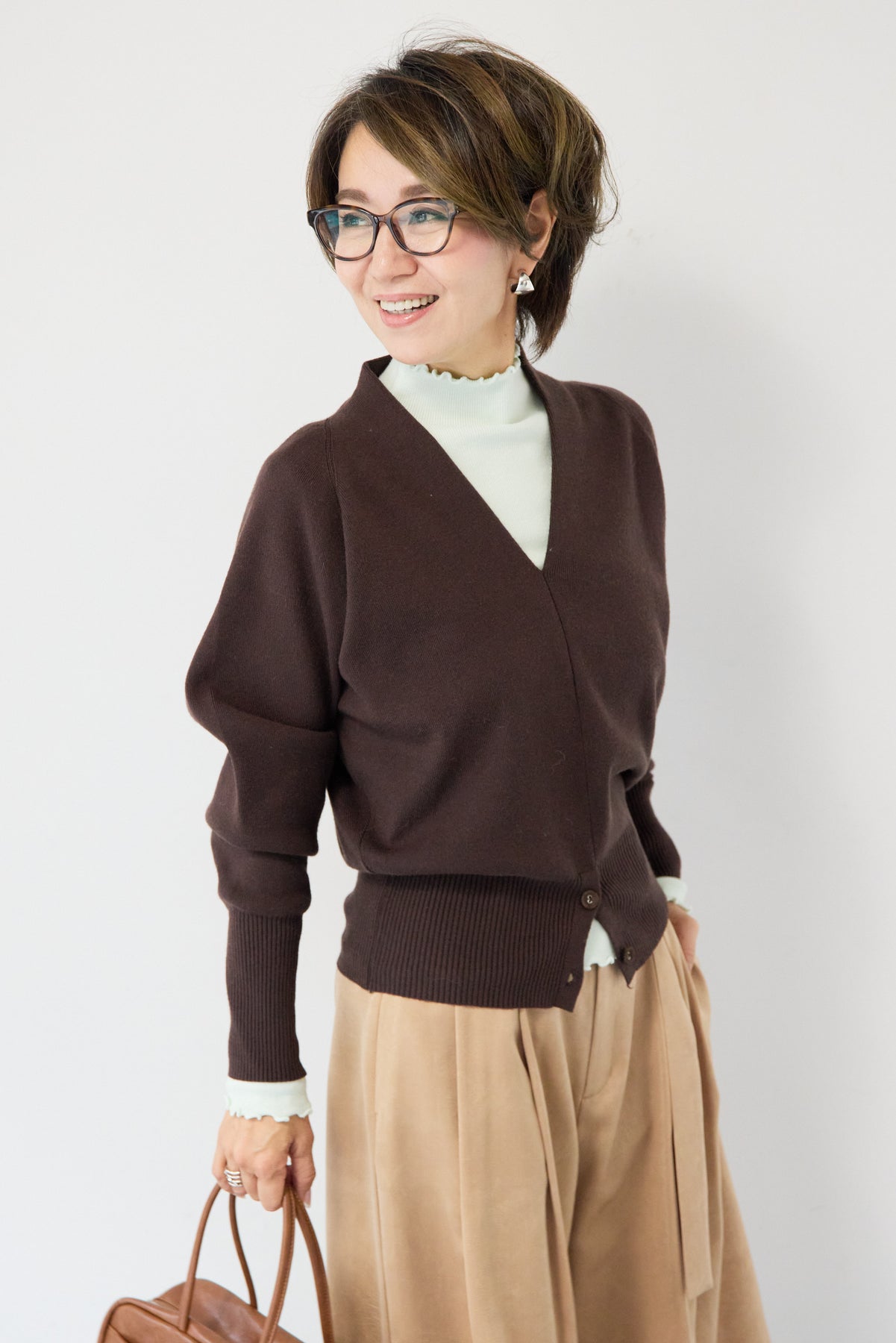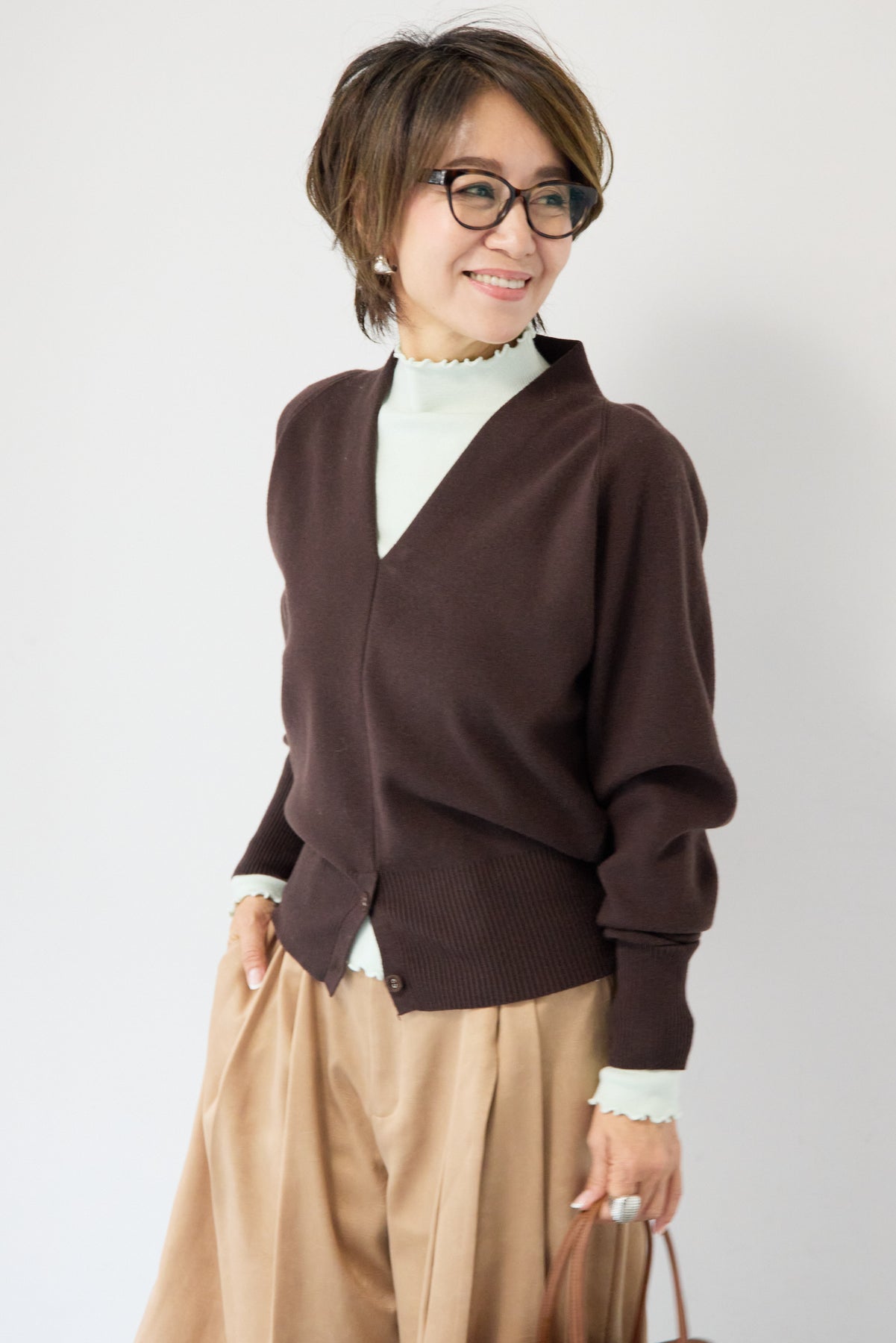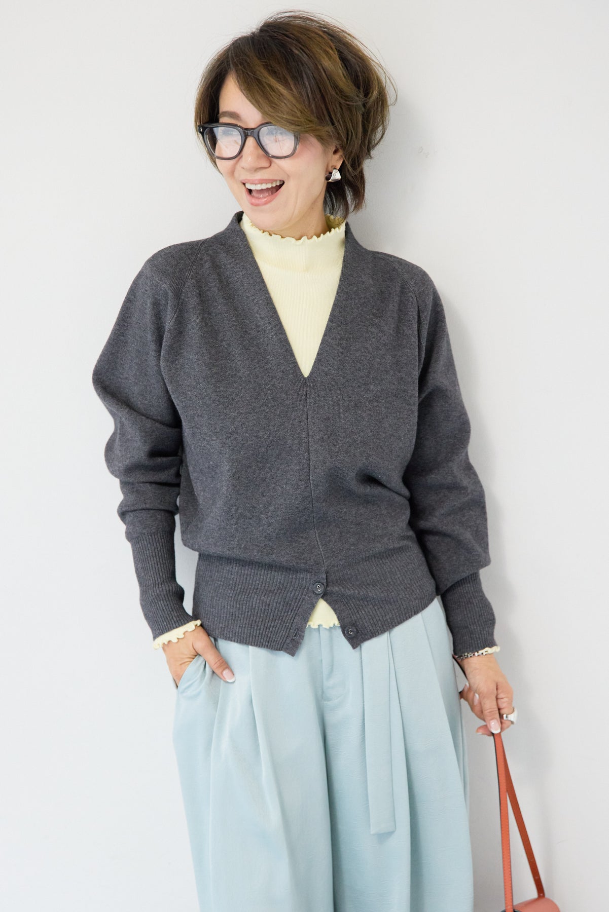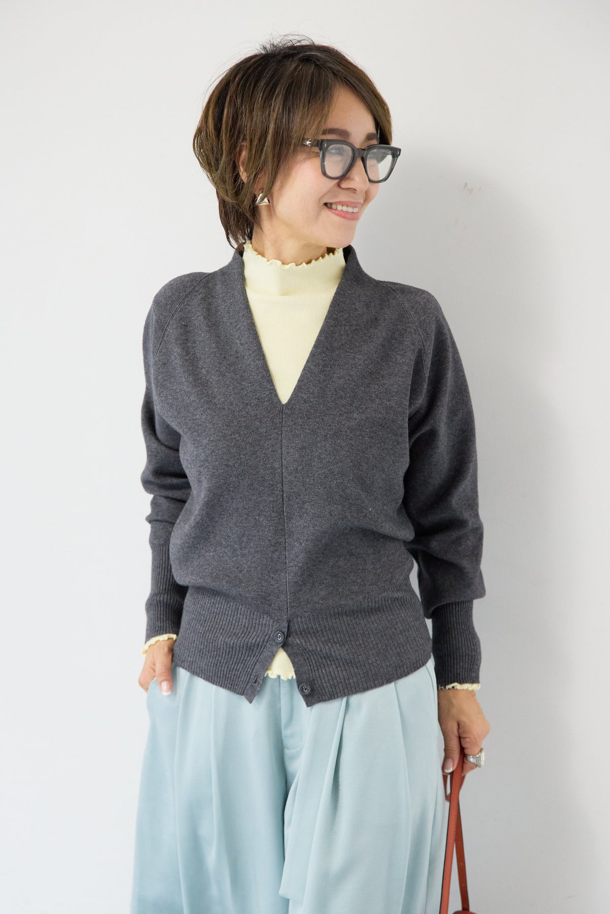 シンプルで洗練されたデザインが魅力の、ベーシックVネックコンパクトニット。程よく開いたVネックがデコルテをすっきりと美しく見せ、インナーとのレイヤードも楽しめる一枚です。身頃はややコンパクトなシルエットながら、柔らかく伸びのあるニット素材を使用しているため、窮屈感なく快適な着心地。ラグランスリーブ仕様で肩まわりに自然な丸みが生まれ、女性らしい柔らかな印象を演出します。裾と袖口はリブ切替デザインで、全体を引き締めつつバランス良く仕上げています。フロントのさりげないボタンディテールが、シンプルな中にも表情をプラス。スカートにもパンツにも合わせやすく、オン・オフ問わず活躍する万能ニットです。