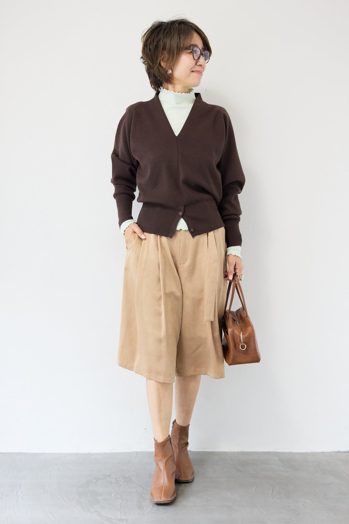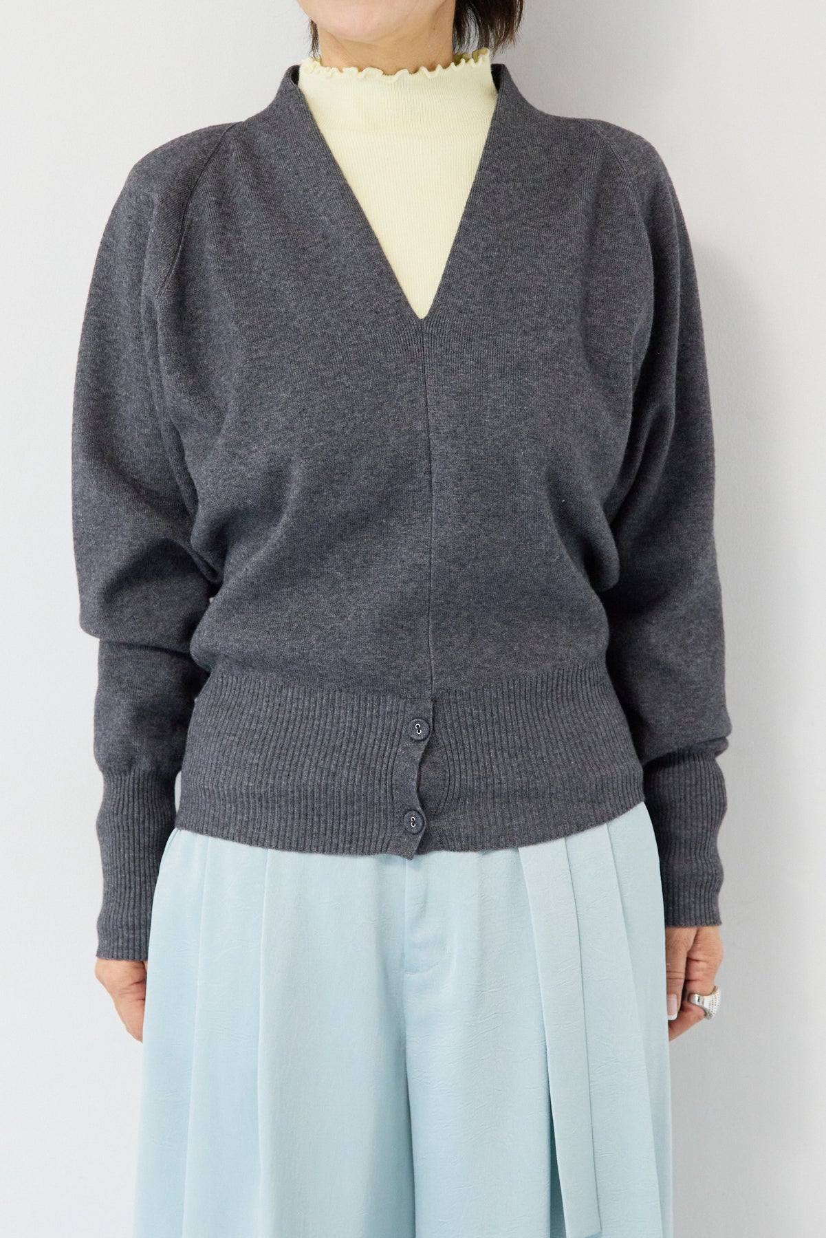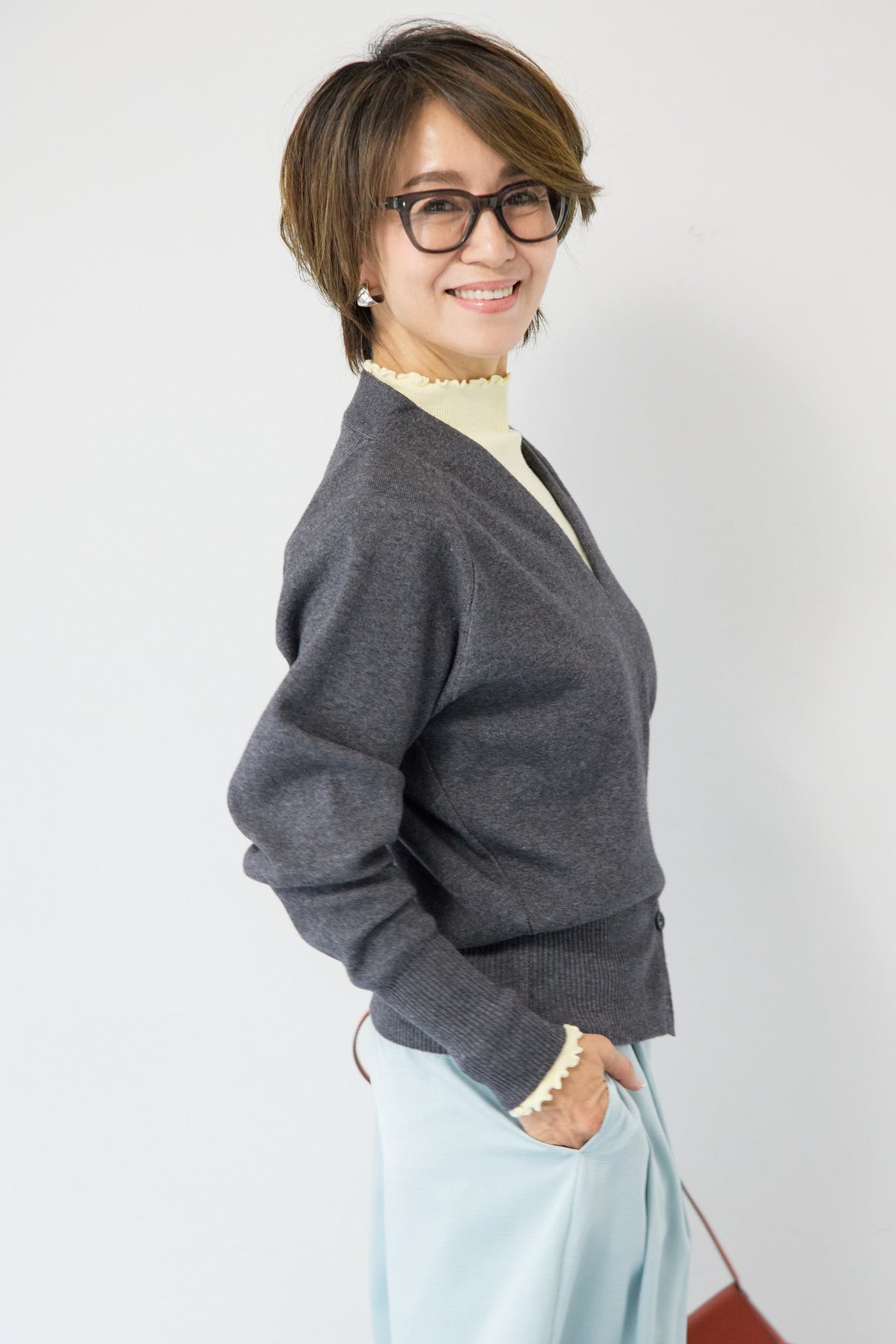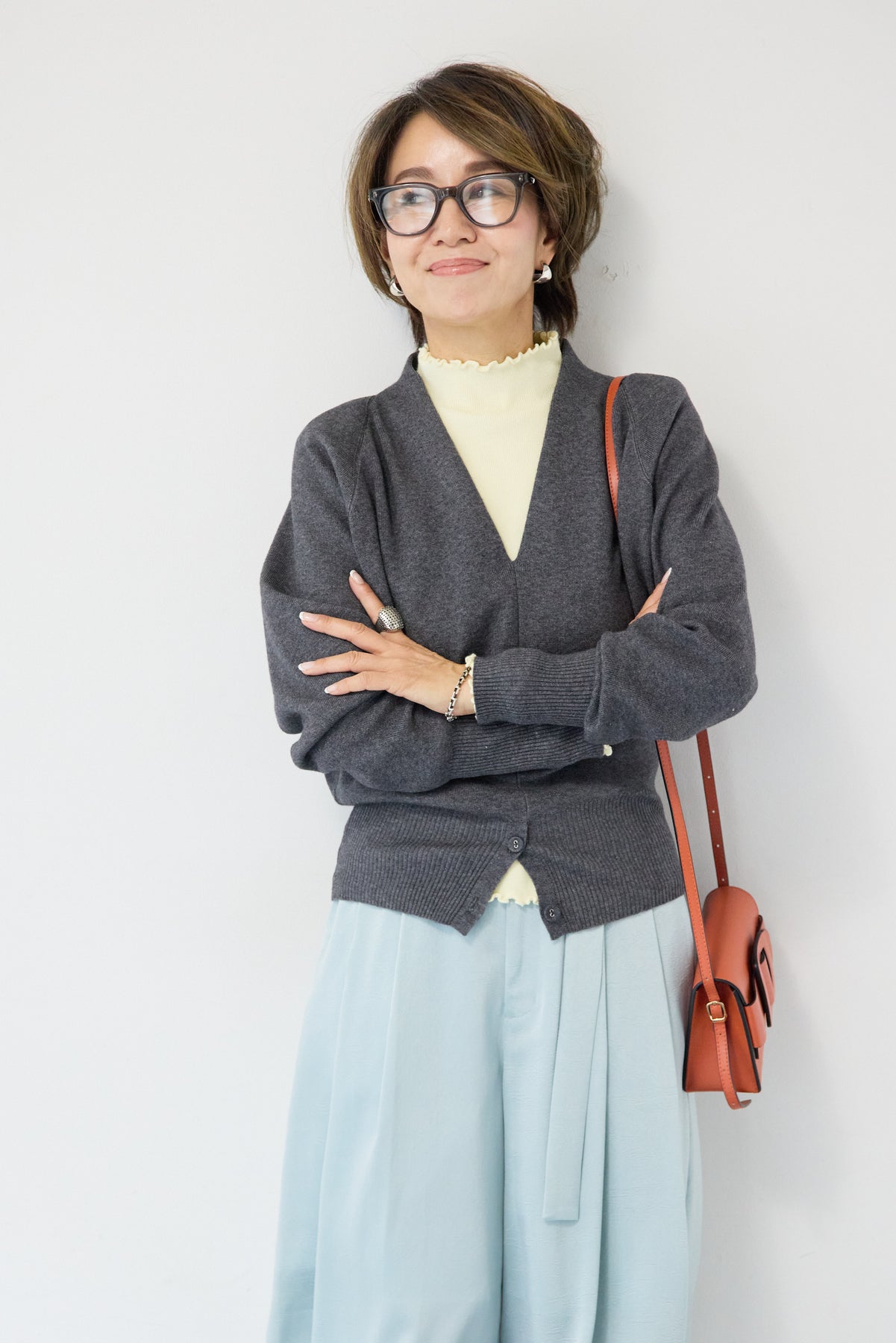 シンプルで洗練されたデザインが魅力の、ベーシックVネックコンパクトニット。程よく開いたVネックがデコルテをすっきりと美しく見せ、インナーとのレイヤードも楽しめる一枚です。身頃はややコンパクトなシルエットながら、柔らかく伸びのあるニット素材を使用しているため、窮屈感なく快適な着心地。ラグランスリーブ仕様で肩まわりに自然な丸みが生まれ、女性らしい柔らかな印象を演出します。裾と袖口はリブ切替デザインで、全体を引き締めつつバランス良く仕上げています。フロントのさりげないボタンディテールが、シンプルな中にも表情をプラス。スカートにもパンツにも合わせやすく、オン・オフ問わず活躍する万能ニットです。