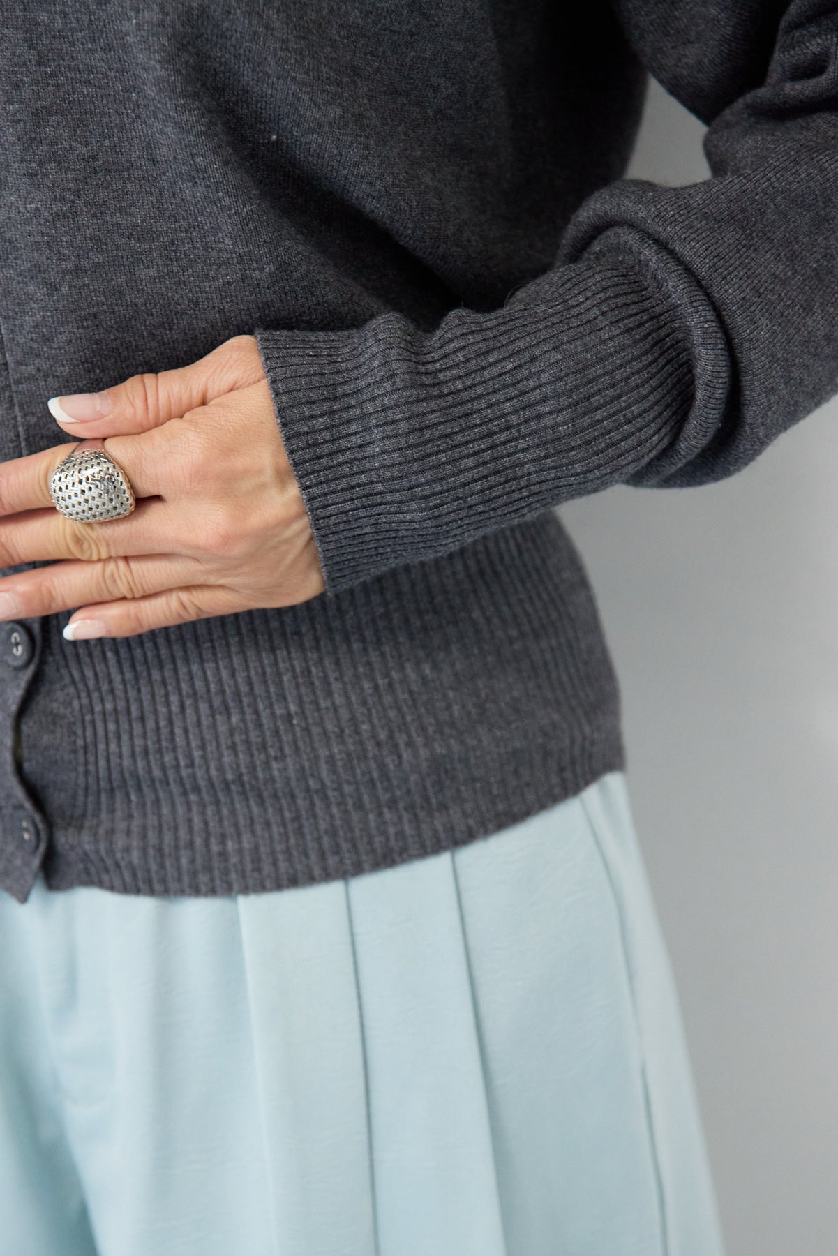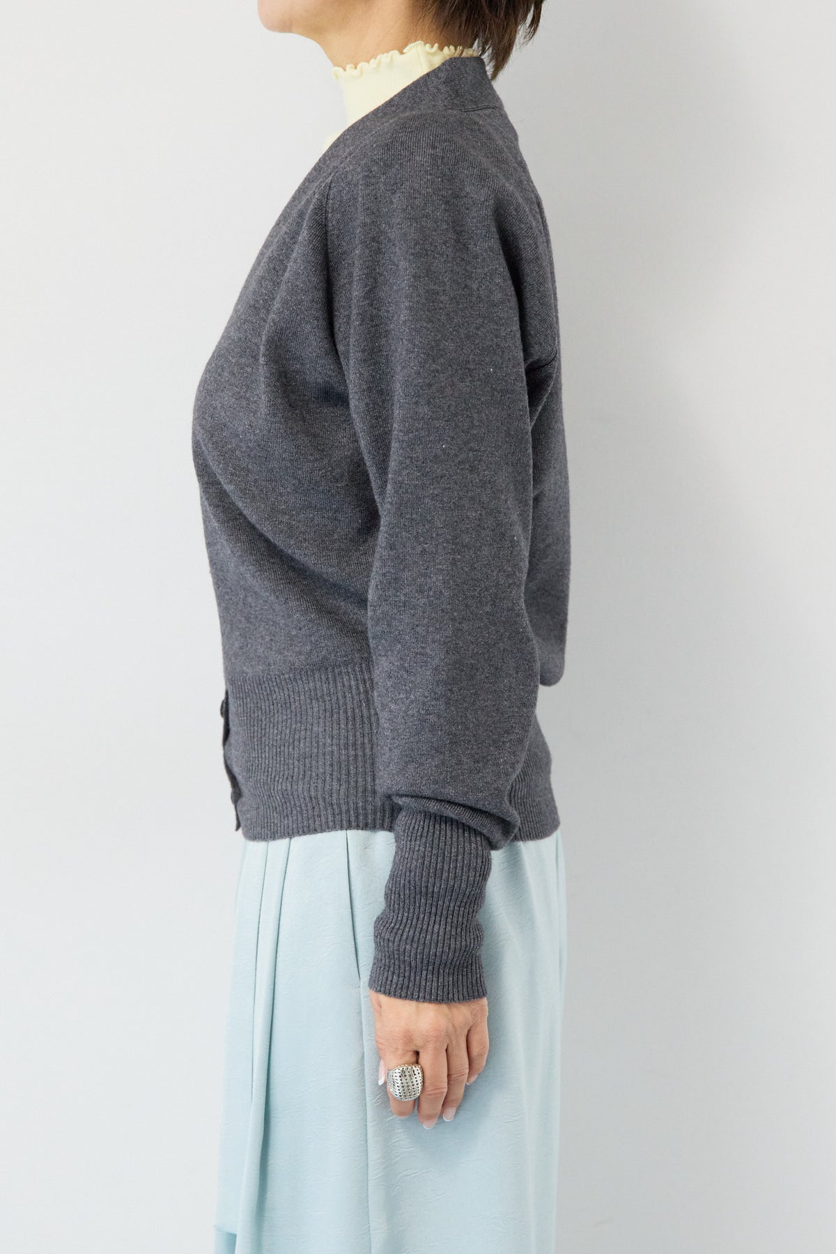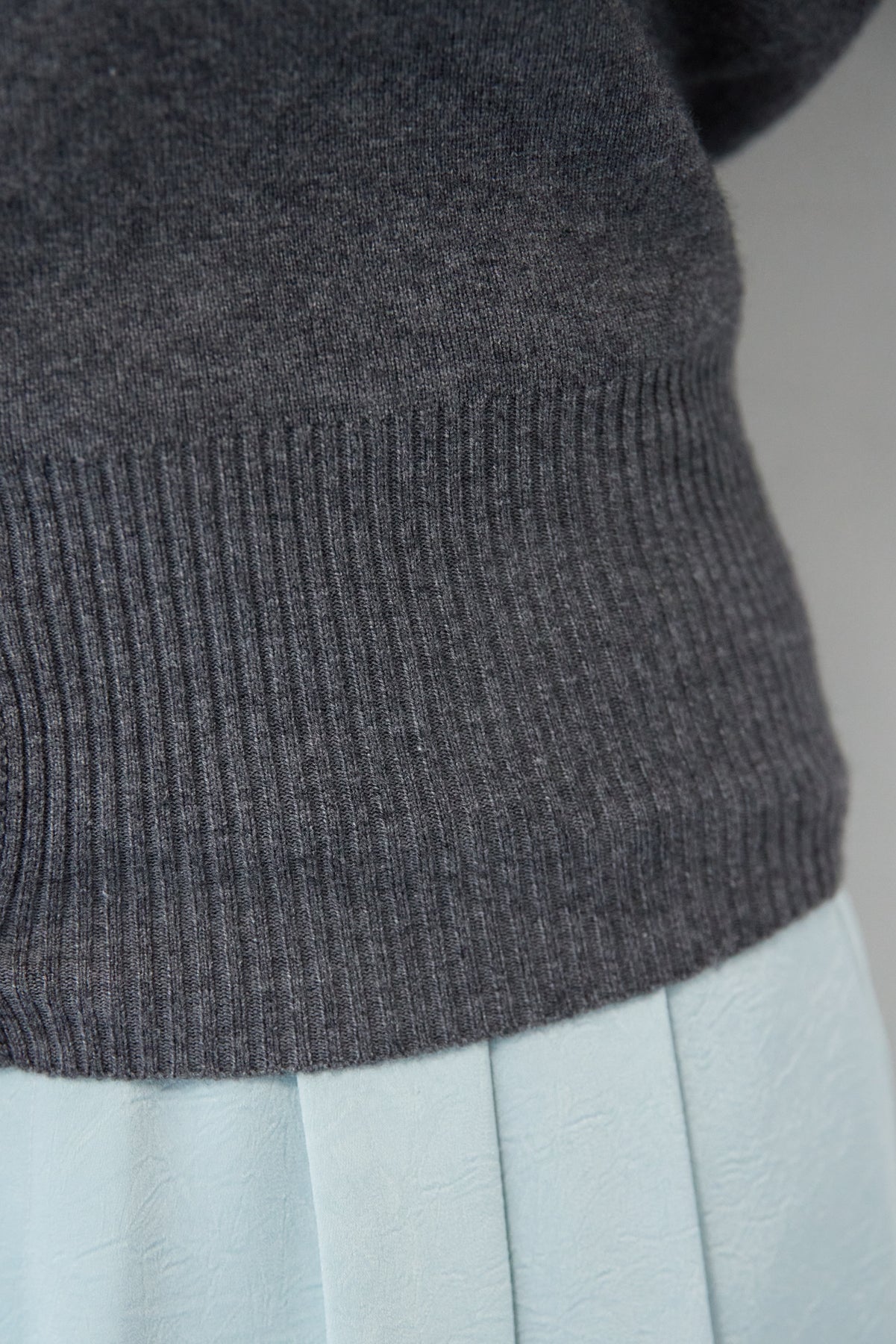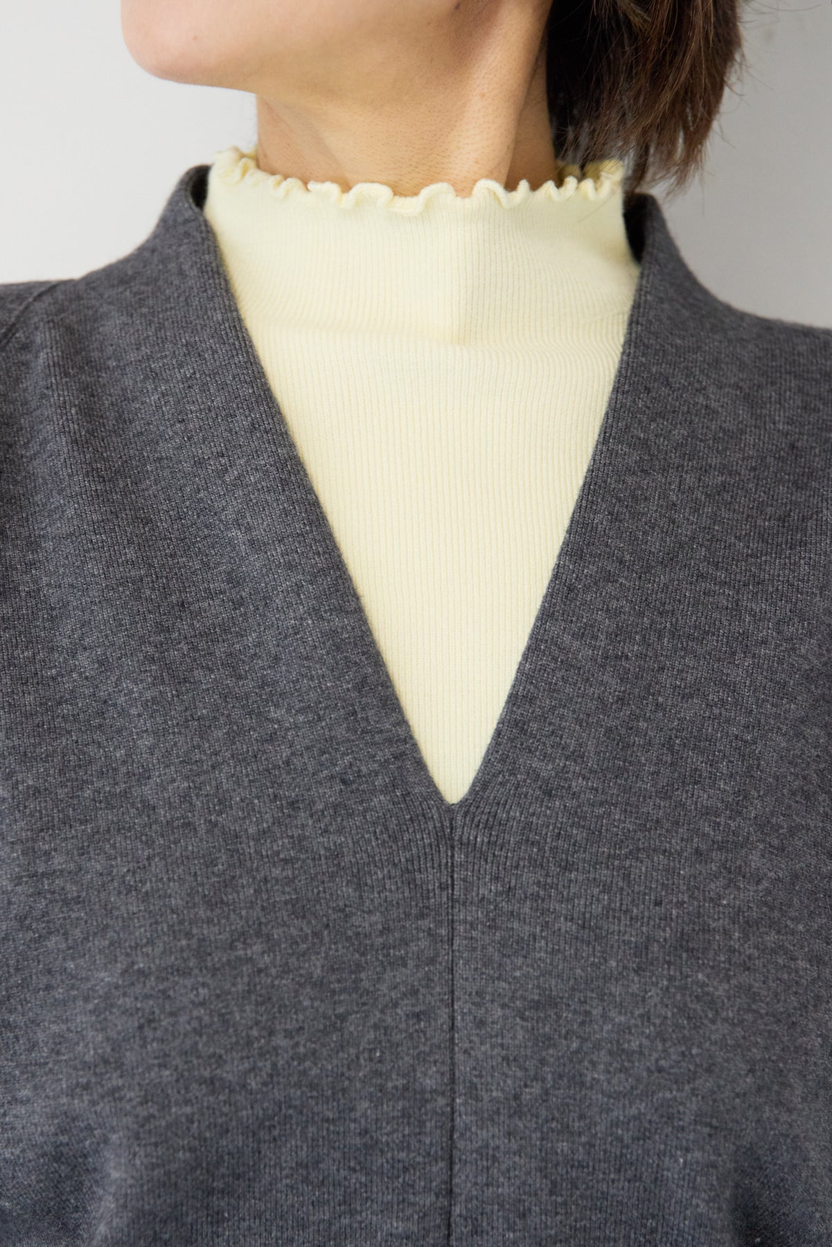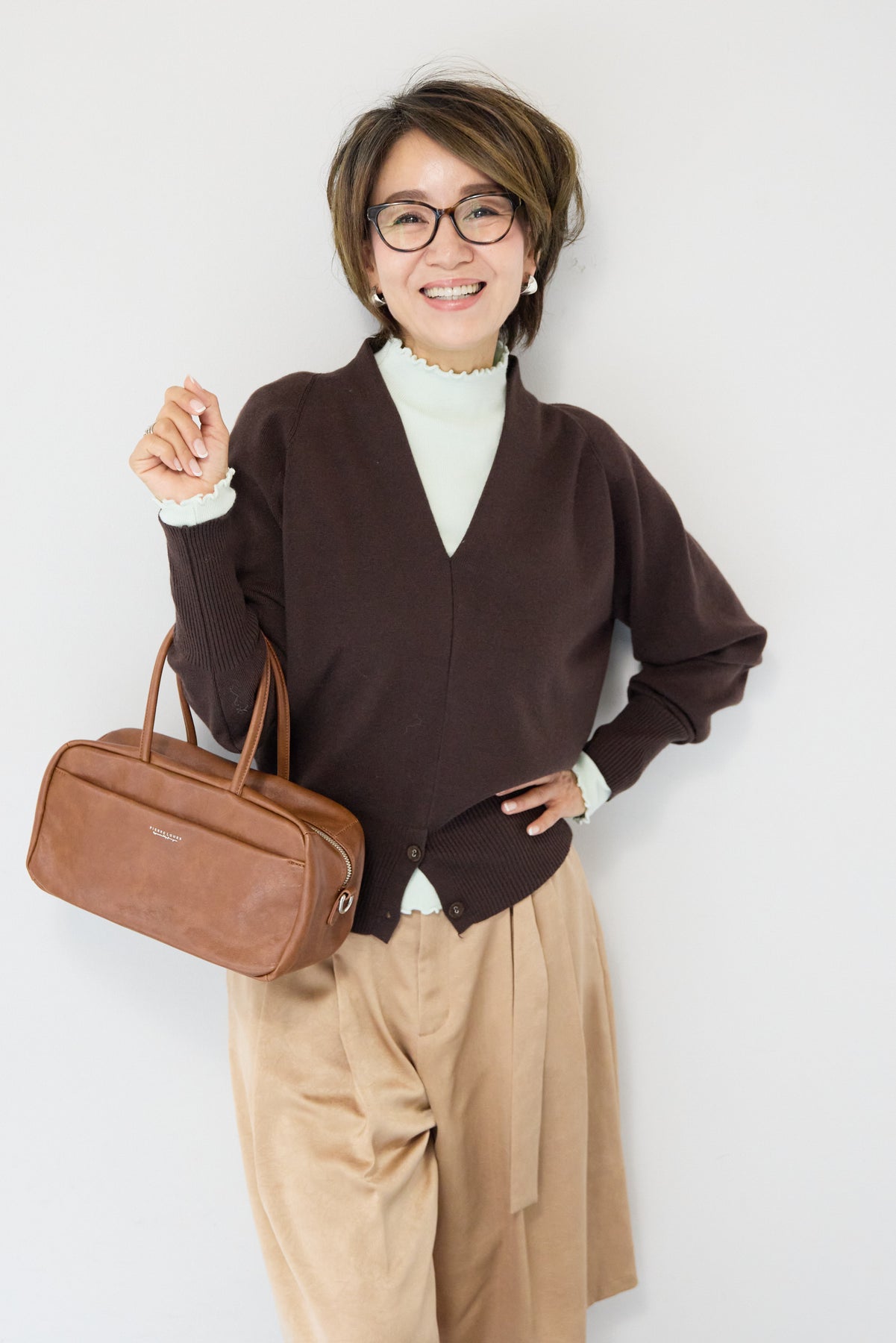シンプルで洗練されたデザインが魅力の、ベーシックVネックコンパクトニット。程よく開いたVネックがデコルテをすっきりと美しく見せ、インナーとのレイヤードも楽しめる一枚です。身頃はややコンパクトなシルエットながら、柔らかく伸びのあるニット素材を使用しているため、窮屈感なく快適な着心地。ラグランスリーブ仕様で肩まわりに自然な丸みが生まれ、女性らしい柔らかな印象を演出します。裾と袖口はリブ切替デザインで、全体を引き締めつつバランス良く仕上げています。フロントのさりげないボタンディテールが、シンプルな中にも表情をプラス。スカートにもパンツにも合わせやすく、オン・オフ問わず活躍する万能ニットです。