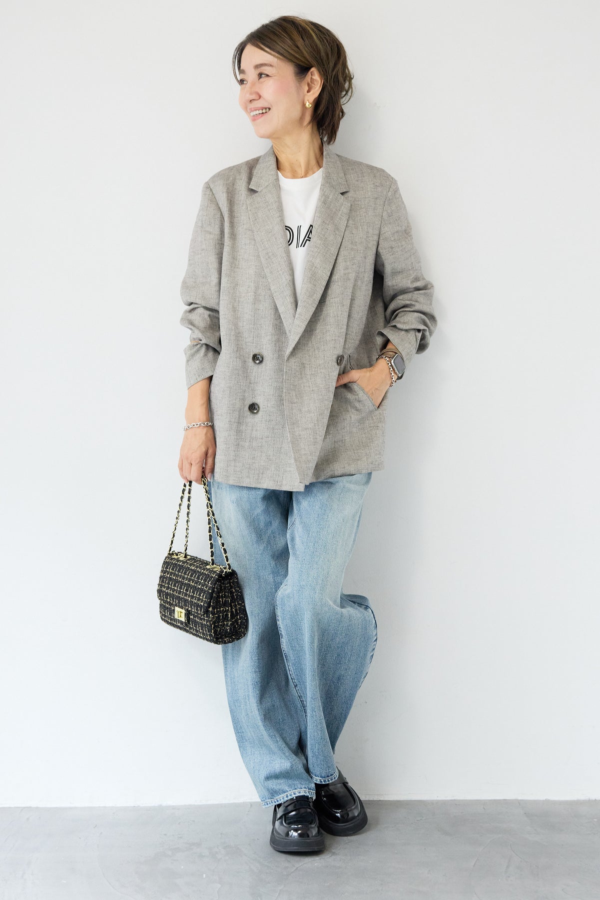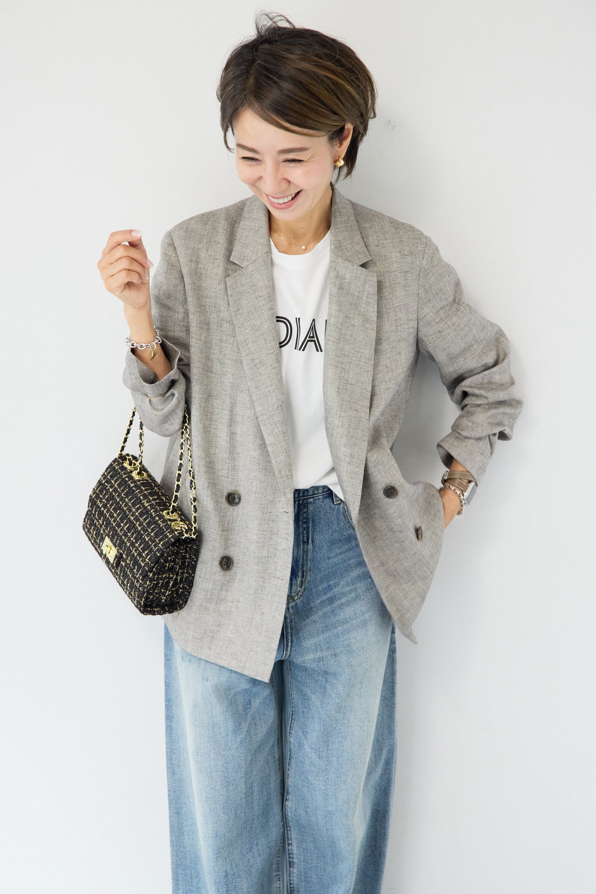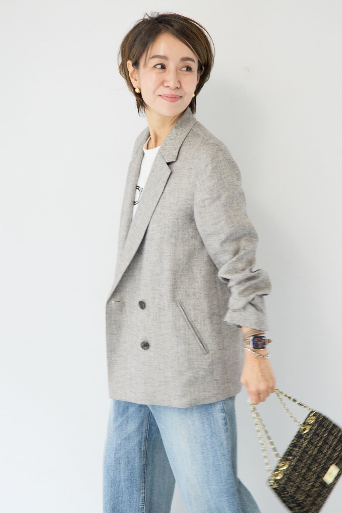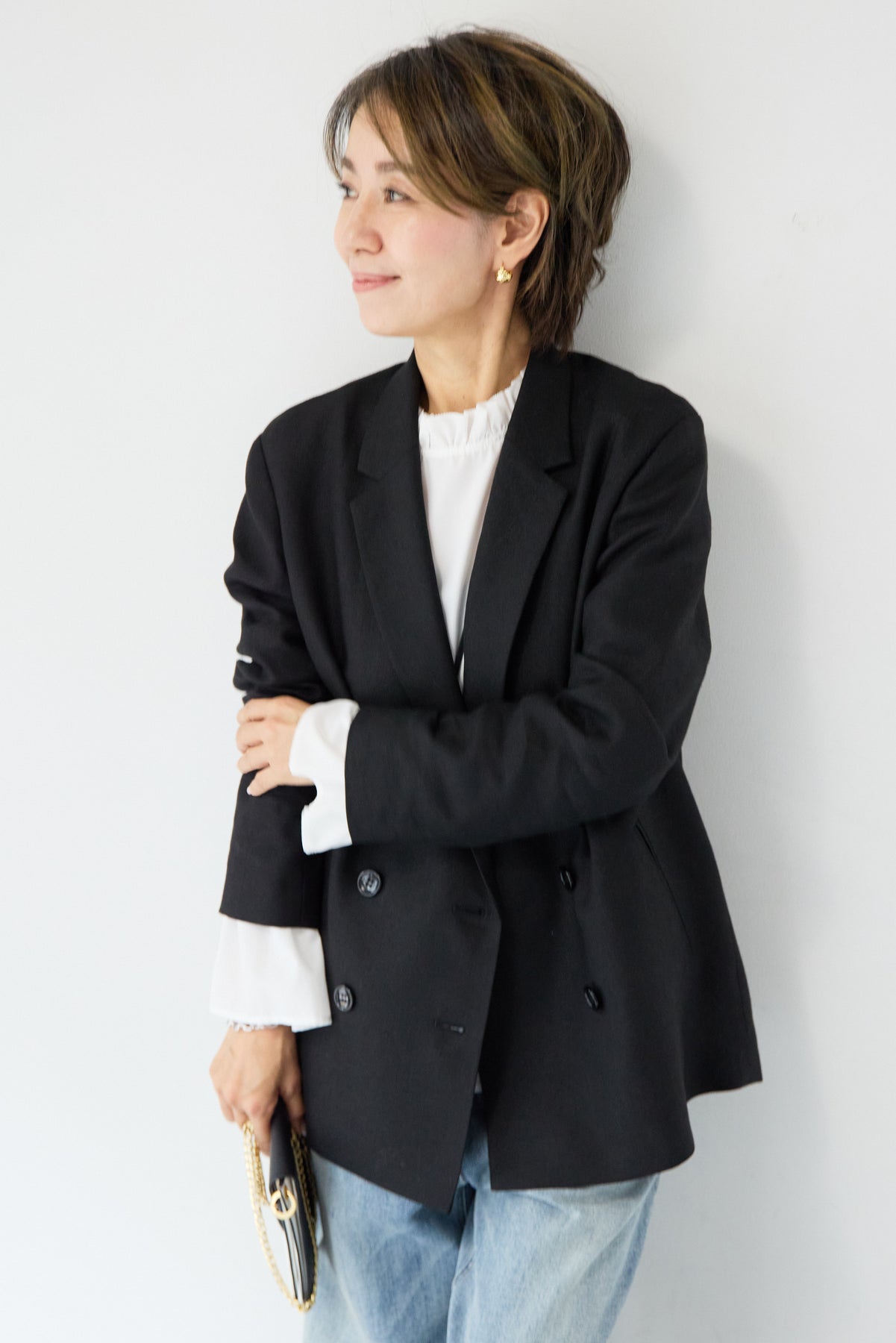 クラシカルな雰囲気と軽やかな着心地を両立した、ツイードライクメッシュダブルジャケット。ツイード調の表情豊かな生地感ながら、メッシュのような織りで通気性が良く、ロングシーズン快適に着用いただけます。程よくゆとりのあるシルエットとダブルブレストデザインが、羽織るだけでこなれた印象に。シャープなテーラードカラーがきちんと感を演出しつつ、デニムなどのカジュアルアイテムとも相性抜群です。フロントポケットや裏側の仕様まで丁寧に仕立てられており、軽やかさの中にも上質さを感じる一着。Tシャツの上にさらっと羽織ればデイリーに、ブラウスやきれいめボトムと合わせればオンシーンにも活躍します。