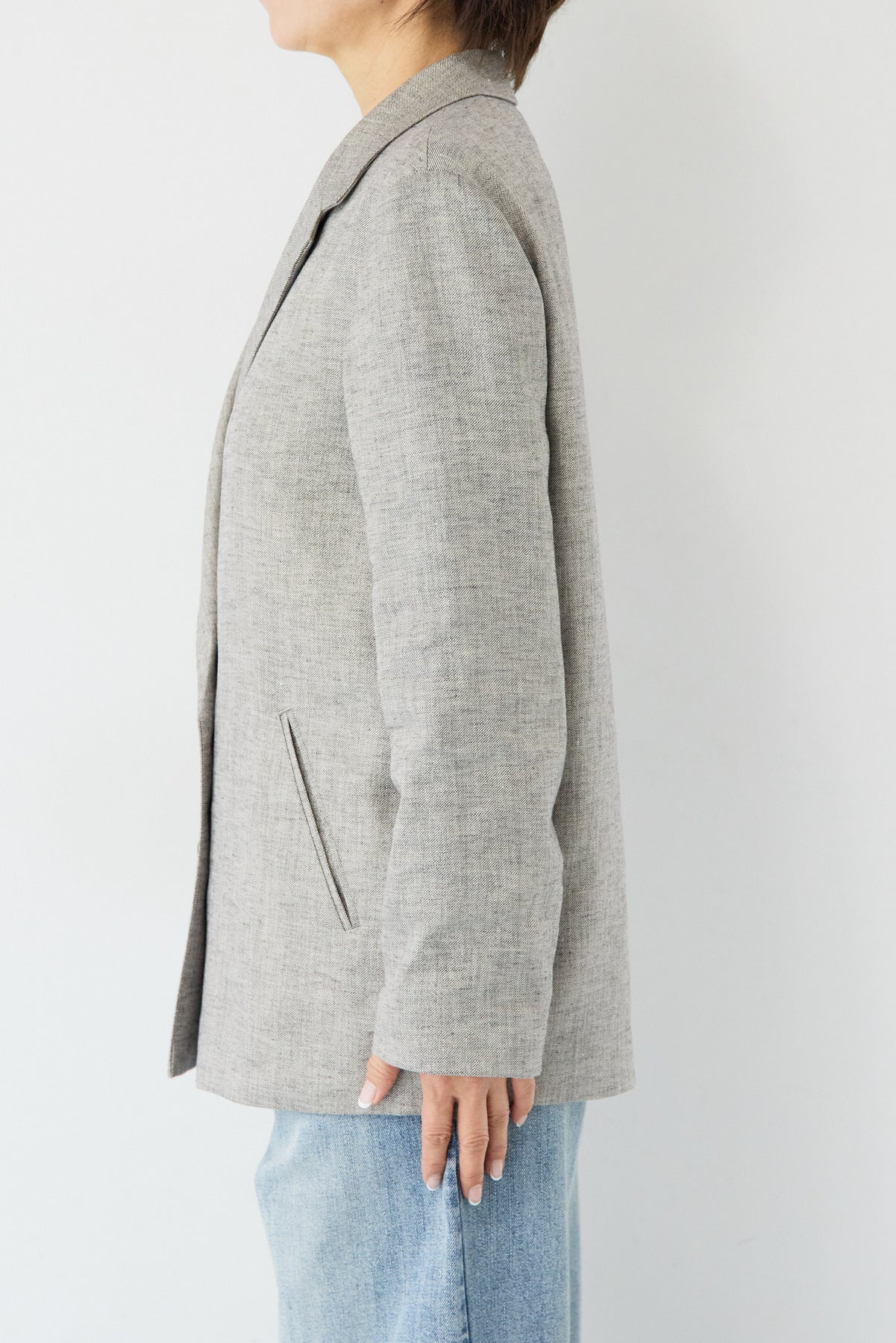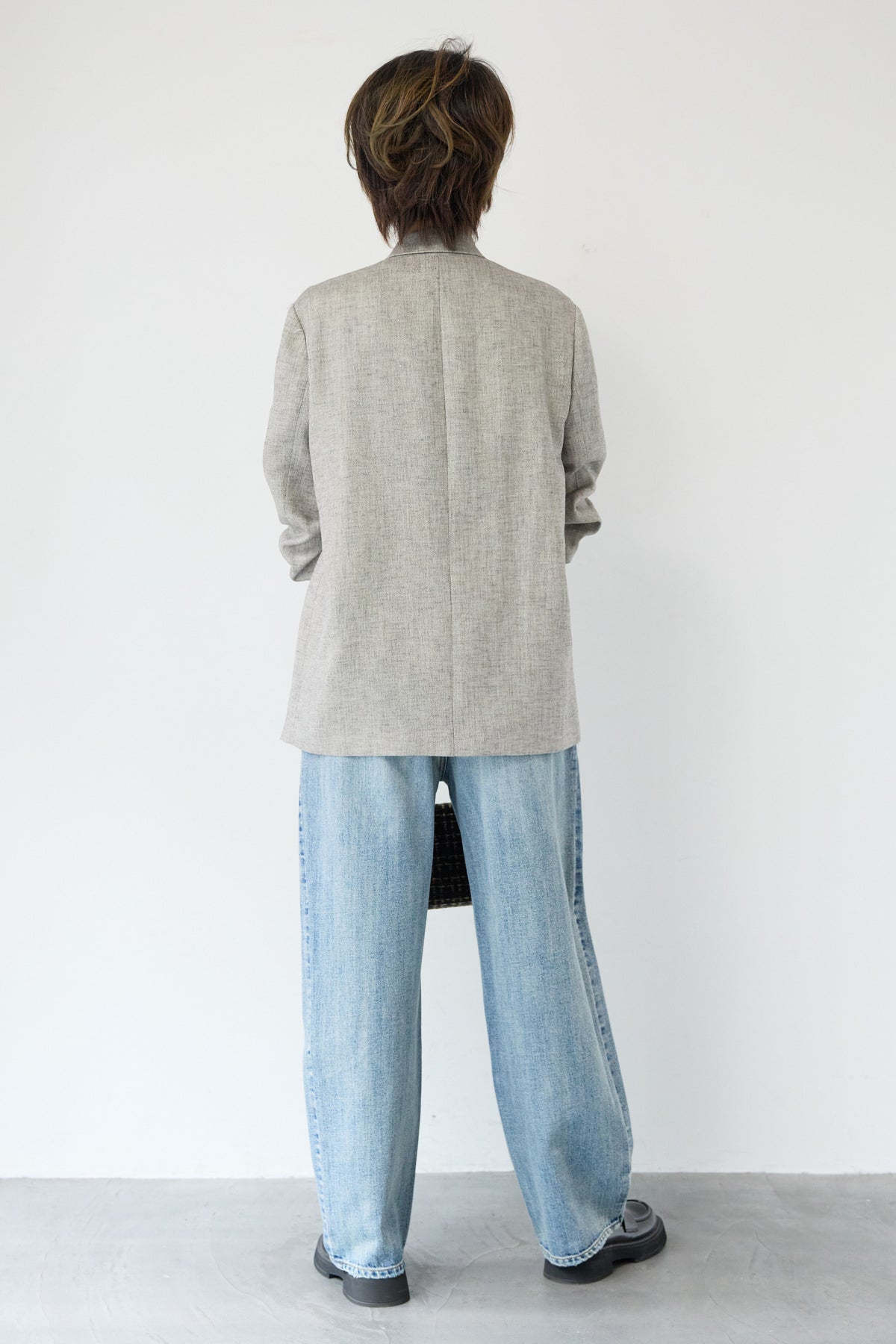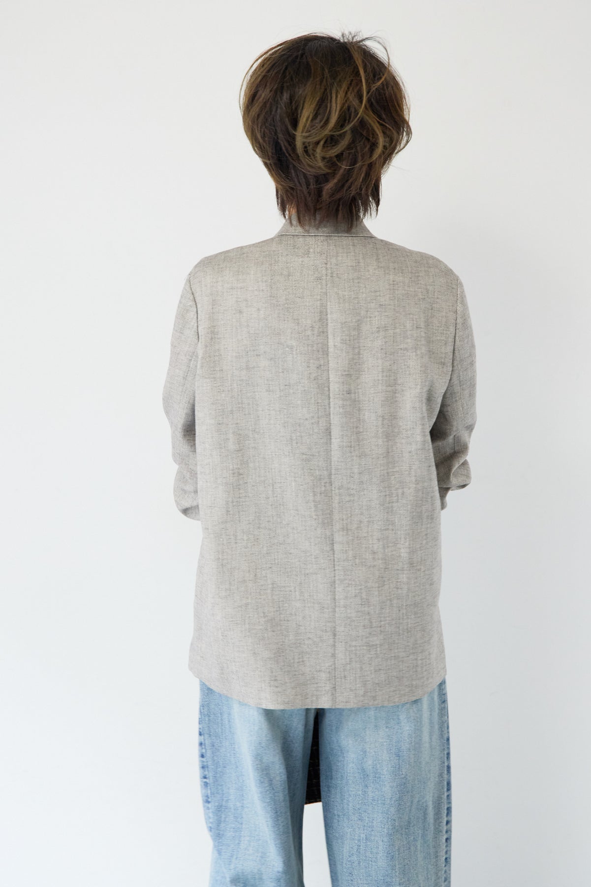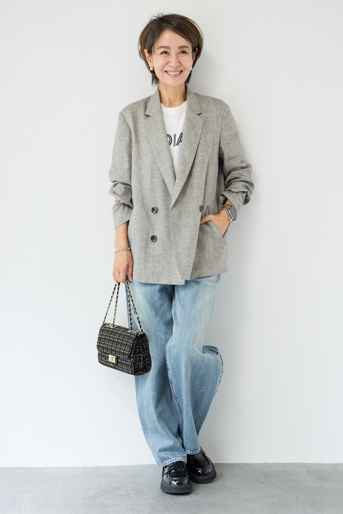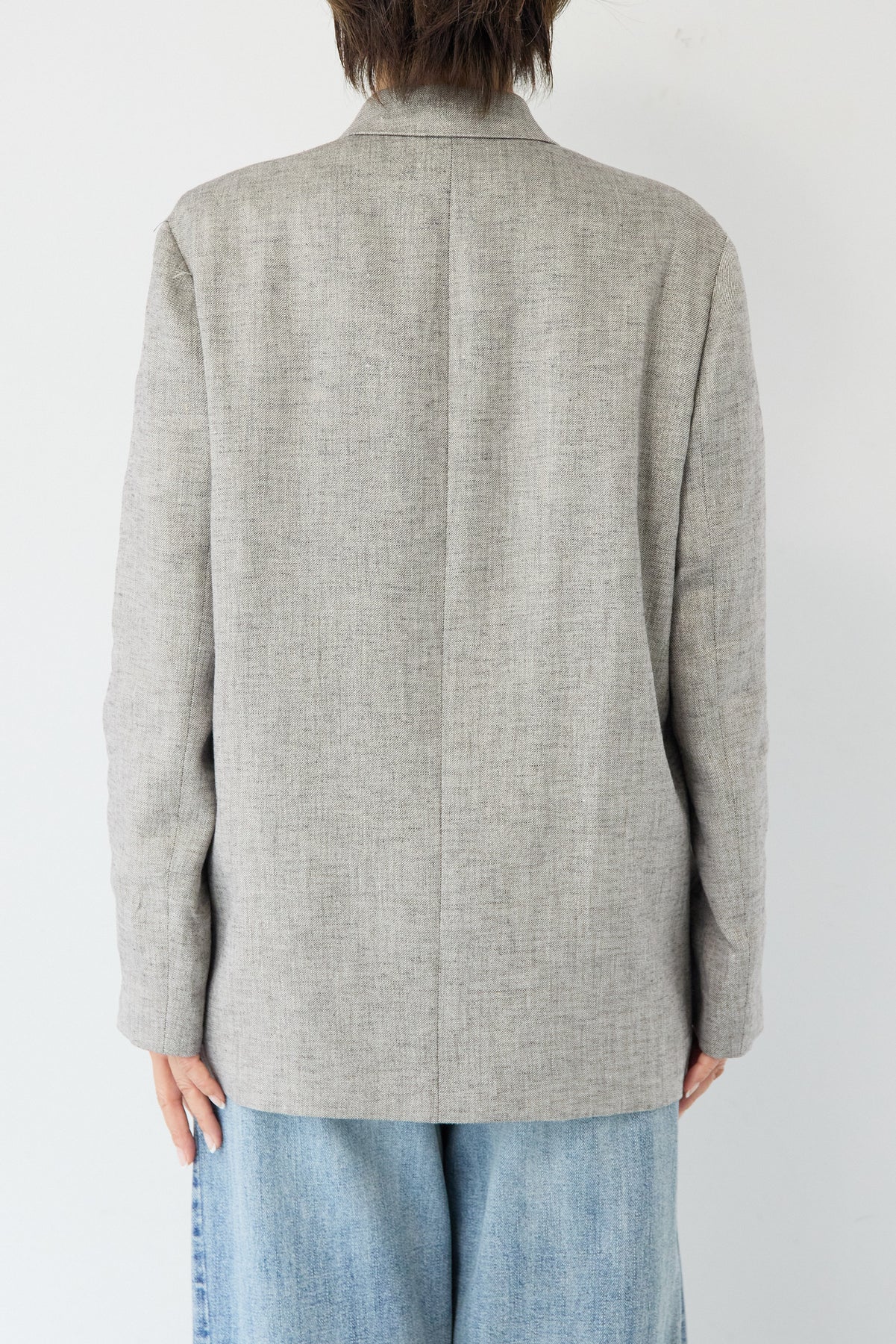 クラシカルな雰囲気と軽やかな着心地を両立した、ツイードライクメッシュダブルジャケット。ツイード調の表情豊かな生地感ながら、メッシュのような織りで通気性が良く、ロングシーズン快適に着用いただけます。程よくゆとりのあるシルエットとダブルブレストデザインが、羽織るだけでこなれた印象に。シャープなテーラードカラーがきちんと感を演出しつつ、デニムなどのカジュアルアイテムとも相性抜群です。フロントポケットや裏側の仕様まで丁寧に仕立てられており、軽やかさの中にも上質さを感じる一着。Tシャツの上にさらっと羽織ればデイリーに、ブラウスやきれいめボトムと合わせればオンシーンにも活躍します。