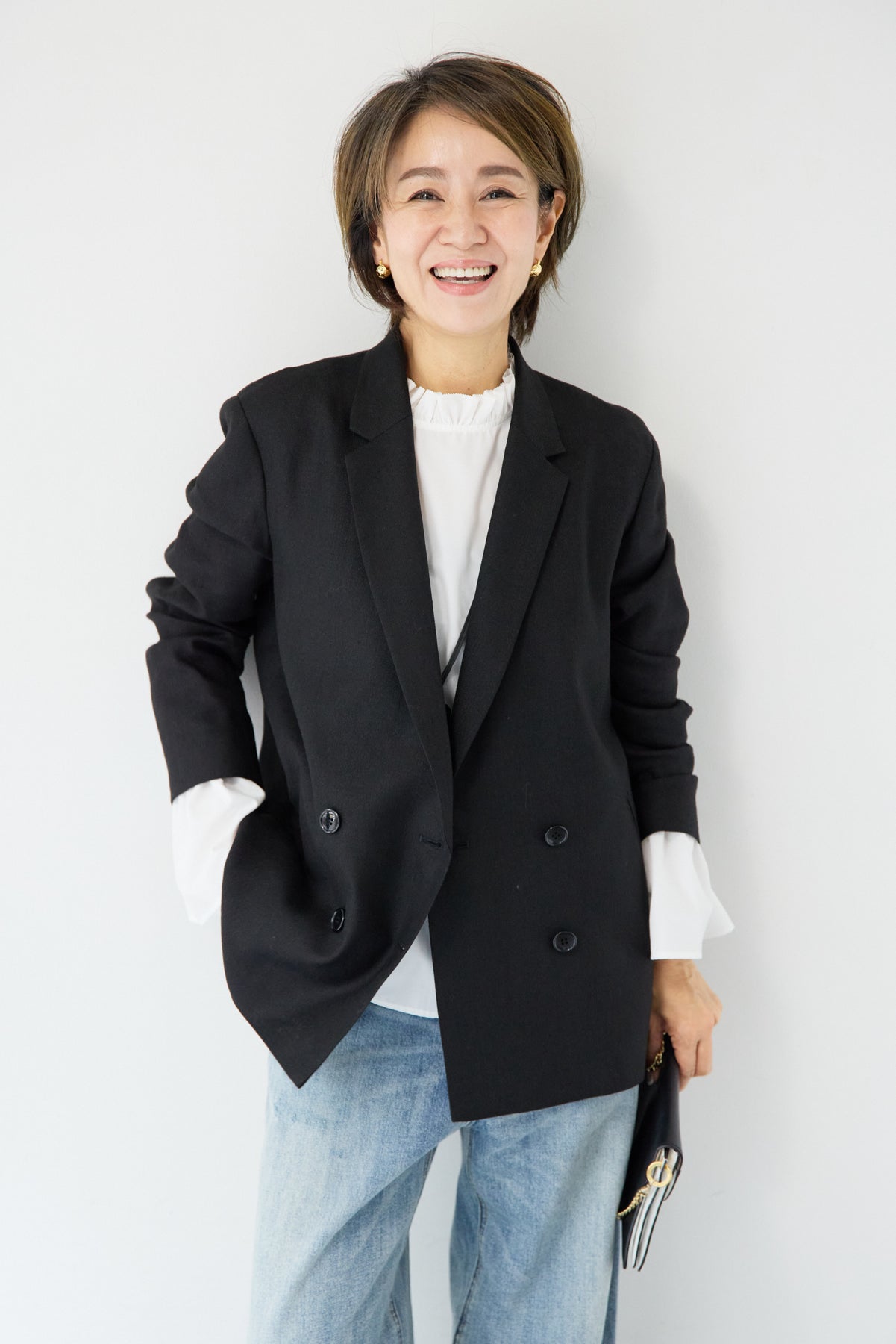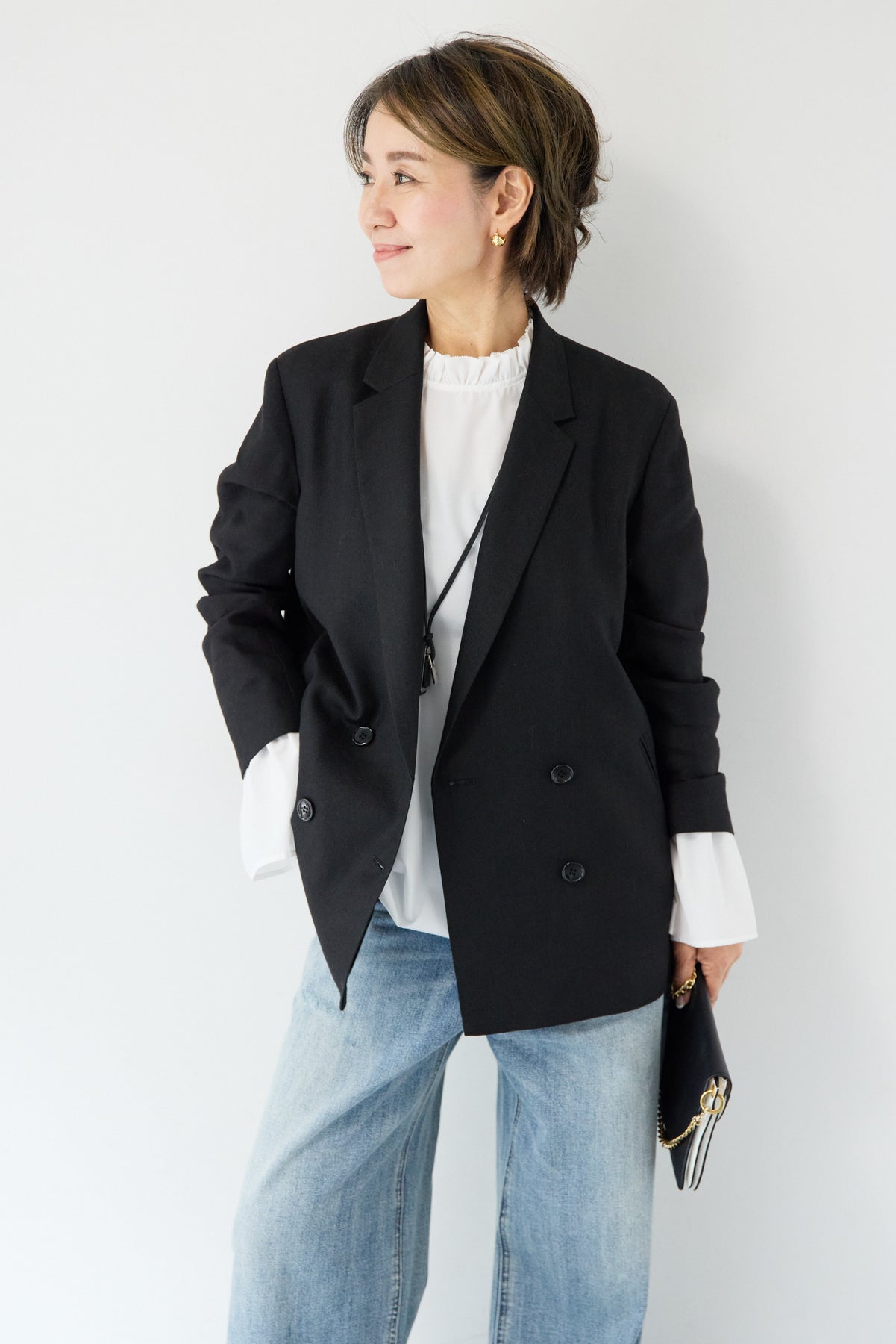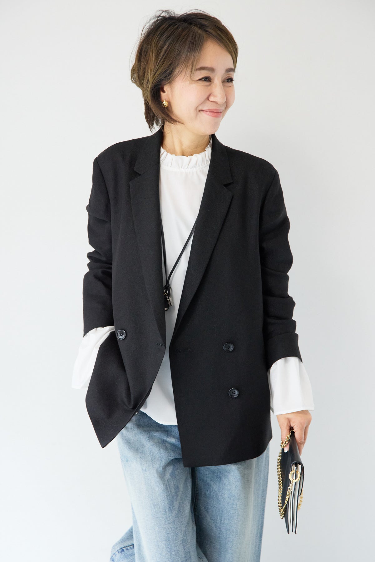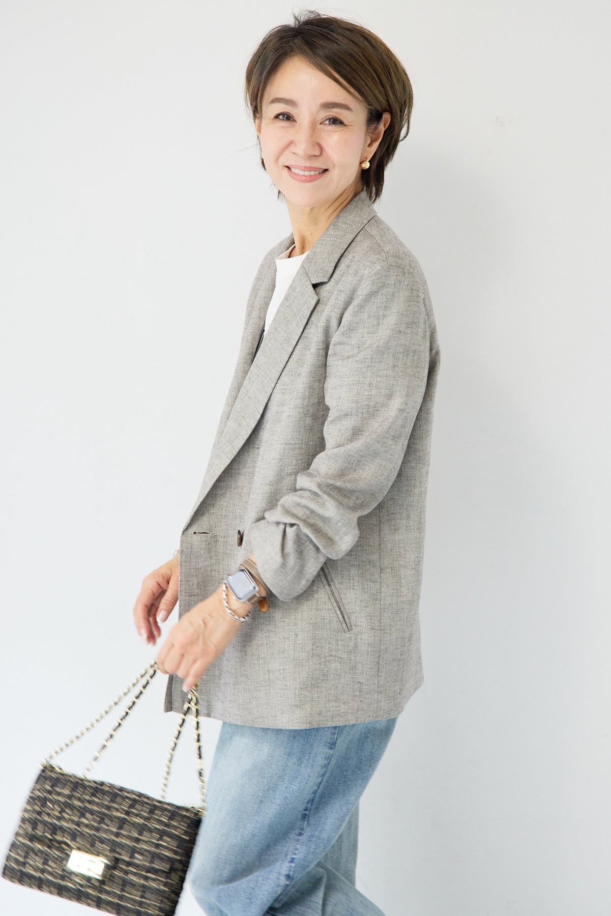 クラシカルな雰囲気と軽やかな着心地を両立した、ツイードライクメッシュダブルジャケット。ツイード調の表情豊かな生地感ながら、メッシュのような織りで通気性が良く、ロングシーズン快適に着用いただけます。程よくゆとりのあるシルエットとダブルブレストデザインが、羽織るだけでこなれた印象に。シャープなテーラードカラーがきちんと感を演出しつつ、デニムなどのカジュアルアイテムとも相性抜群です。フロントポケットや裏側の仕様まで丁寧に仕立てられており、軽やかさの中にも上質さを感じる一着。Tシャツの上にさらっと羽織ればデイリーに、ブラウスやきれいめボトムと合わせればオンシーンにも活躍します。