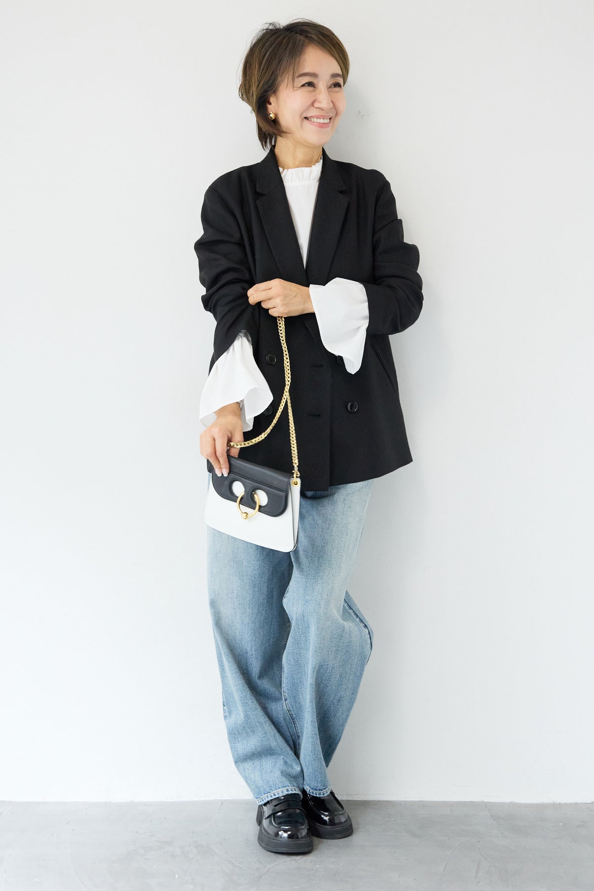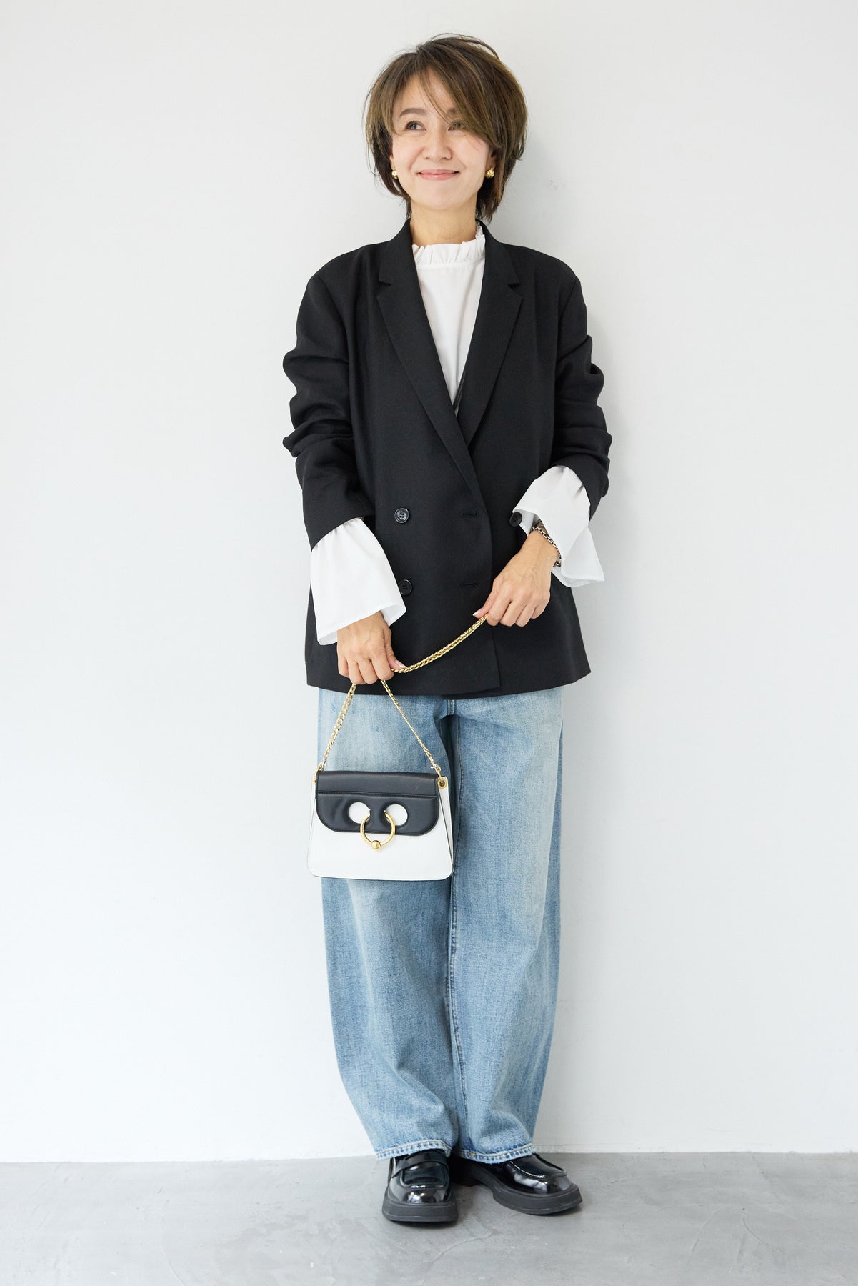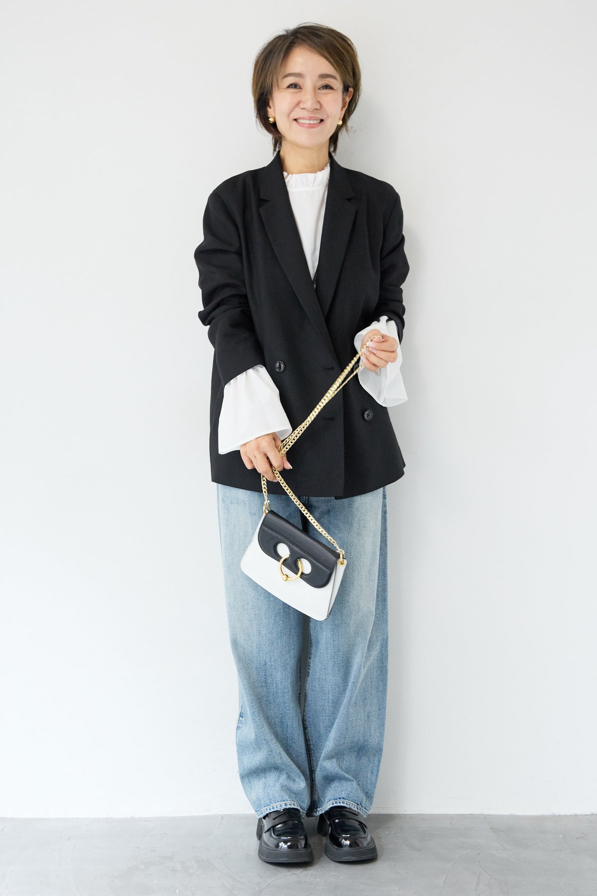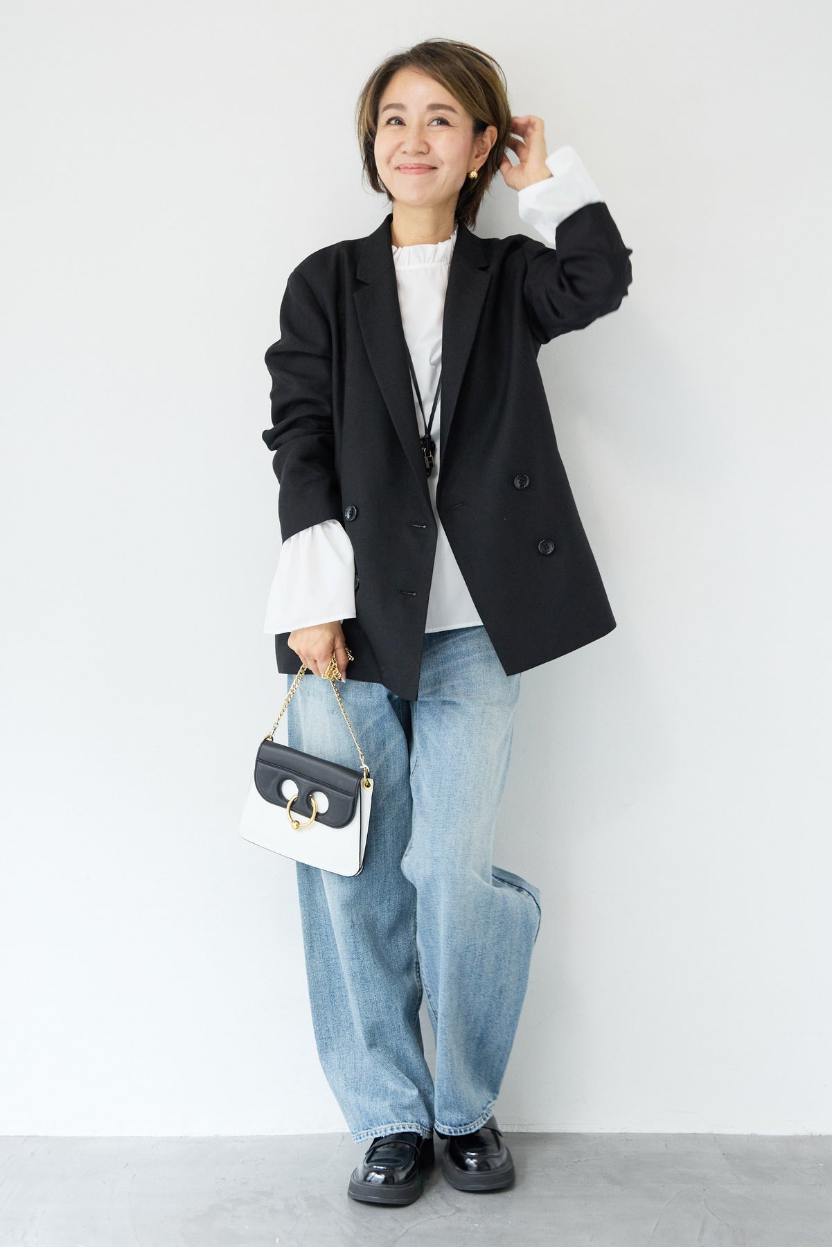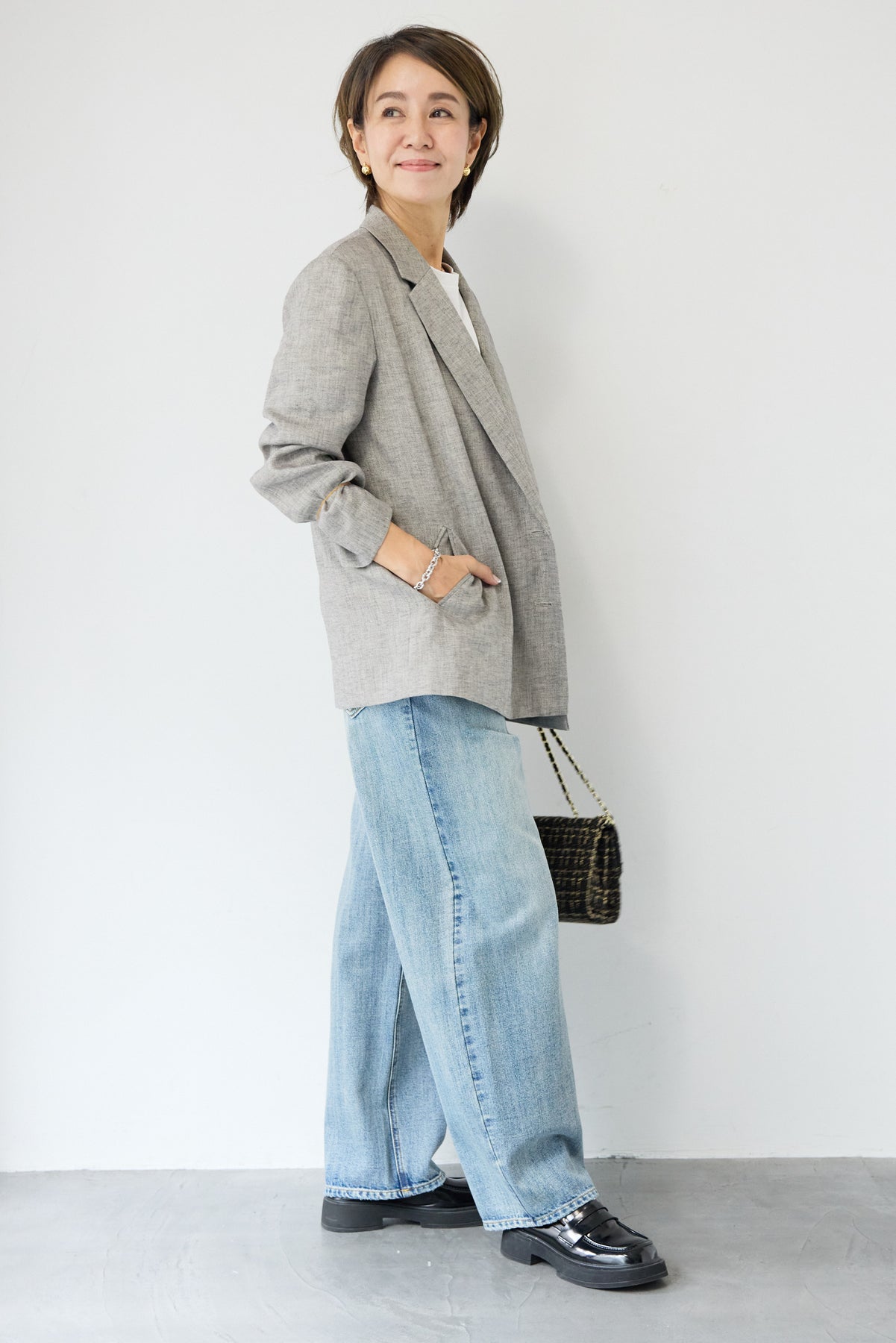 クラシカルな雰囲気と軽やかな着心地を両立した、ツイードライクメッシュダブルジャケット。ツイード調の表情豊かな生地感ながら、メッシュのような織りで通気性が良く、ロングシーズン快適に着用いただけます。程よくゆとりのあるシルエットとダブルブレストデザインが、羽織るだけでこなれた印象に。シャープなテーラードカラーがきちんと感を演出しつつ、デニムなどのカジュアルアイテムとも相性抜群です。フロントポケットや裏側の仕様まで丁寧に仕立てられており、軽やかさの中にも上質さを感じる一着。Tシャツの上にさらっと羽織ればデイリーに、ブラウスやきれいめボトムと合わせればオンシーンにも活躍します。