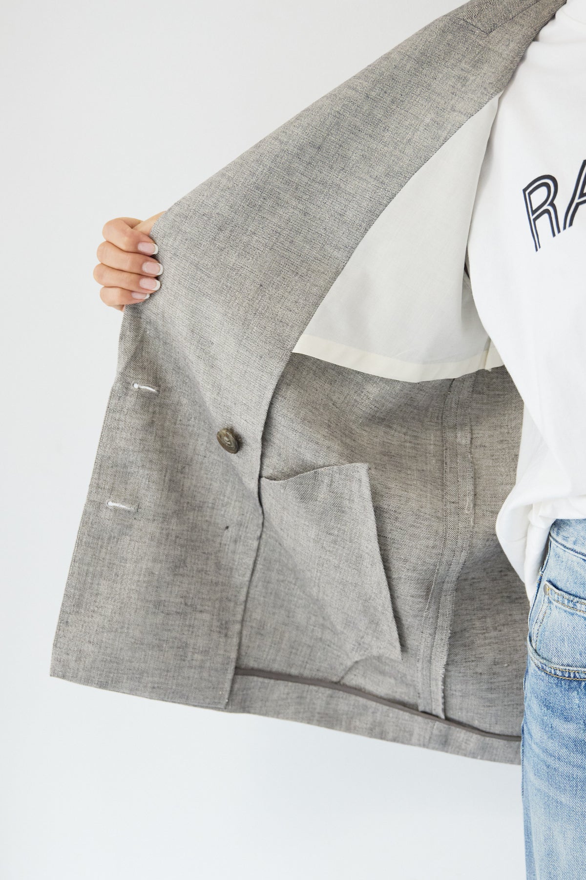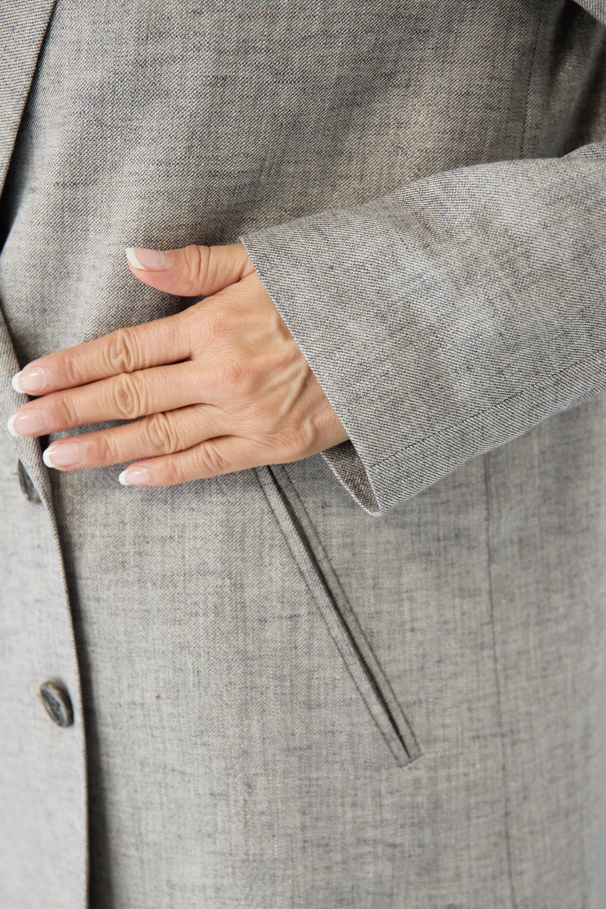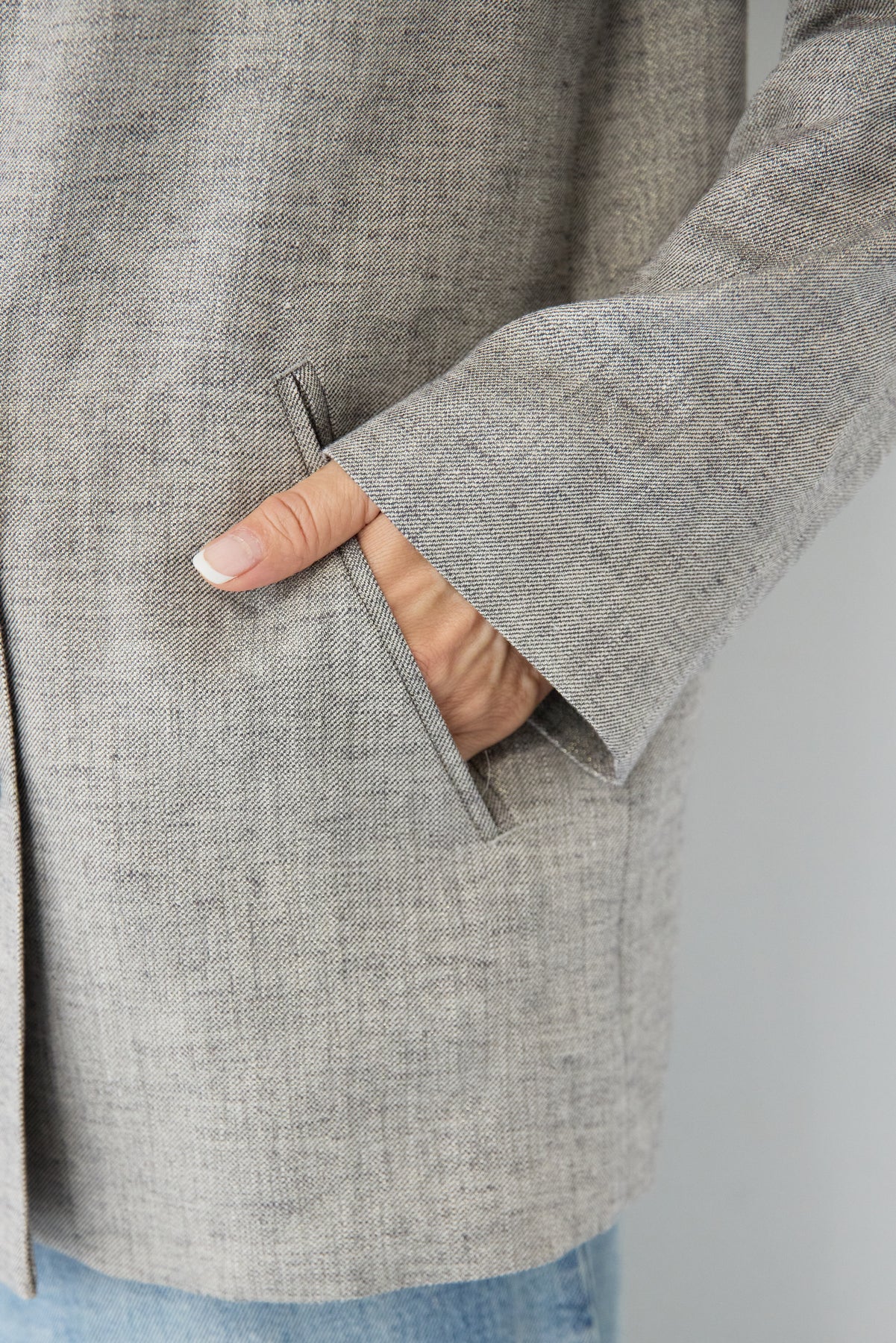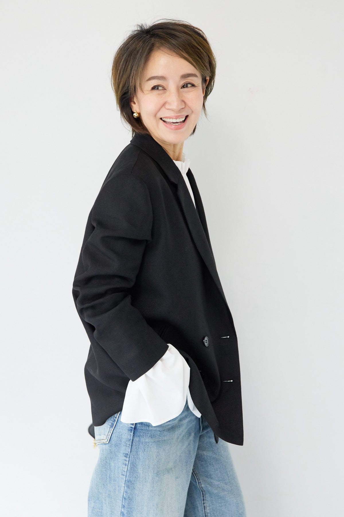 クラシカルな雰囲気と軽やかな着心地を両立した、ツイードライクメッシュダブルジャケット。ツイード調の表情豊かな生地感ながら、メッシュのような織りで通気性が良く、ロングシーズン快適に着用いただけます。程よくゆとりのあるシルエットとダブルブレストデザインが、羽織るだけでこなれた印象に。シャープなテーラードカラーがきちんと感を演出しつつ、デニムなどのカジュアルアイテムとも相性抜群です。フロントポケットや裏側の仕様まで丁寧に仕立てられており、軽やかさの中にも上質さを感じる一着。Tシャツの上にさらっと羽織ればデイリーに、ブラウスやきれいめボトムと合わせればオンシーンにも活躍します。