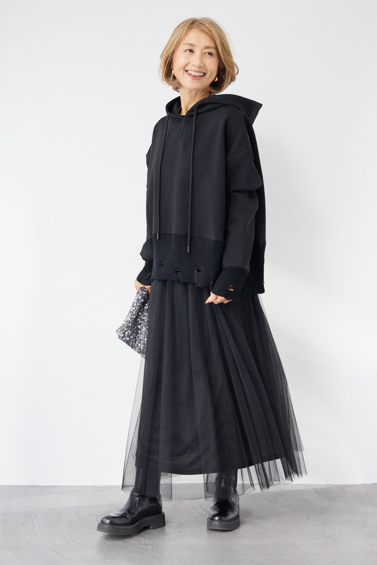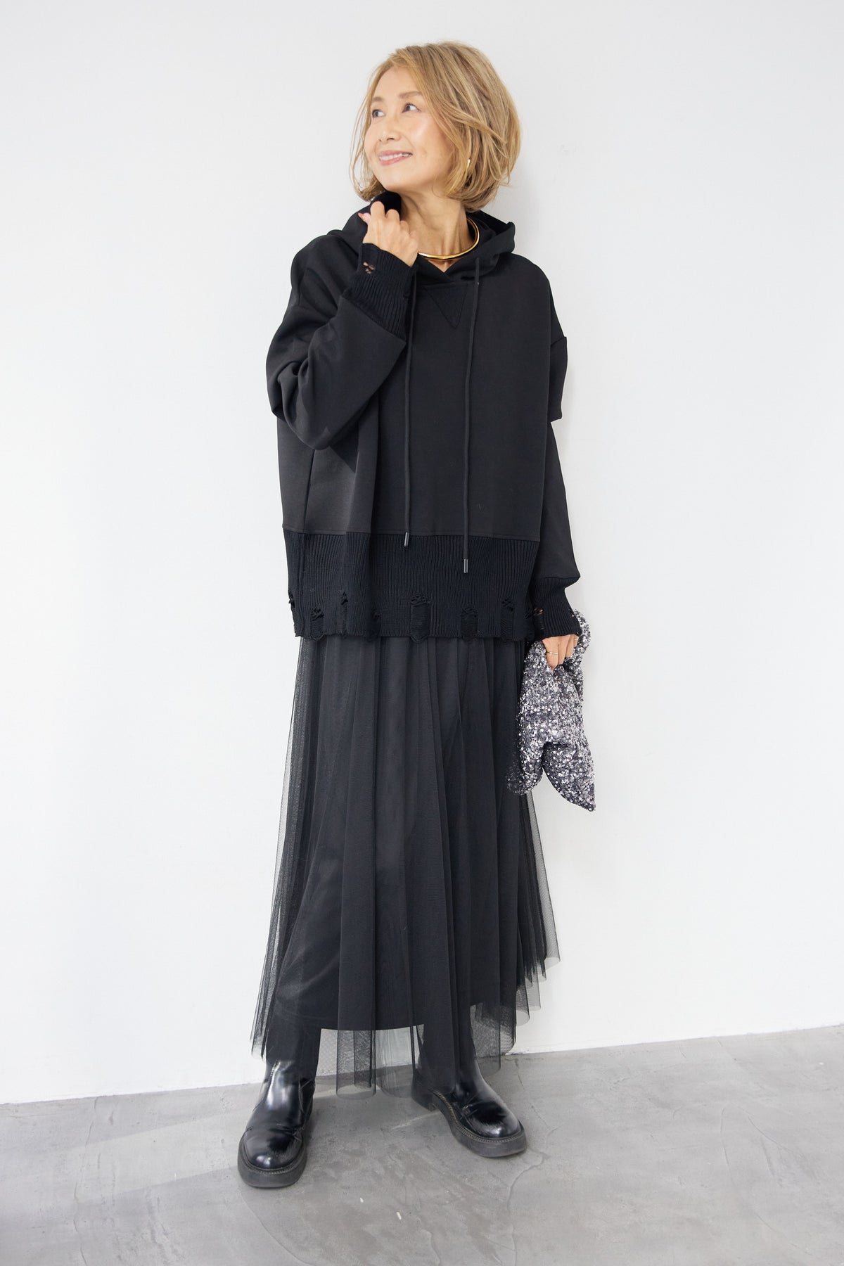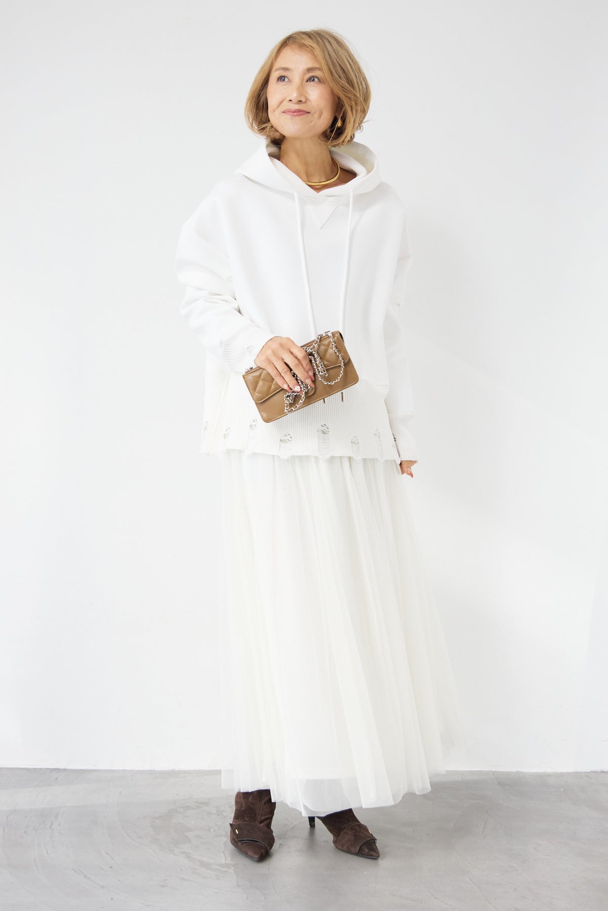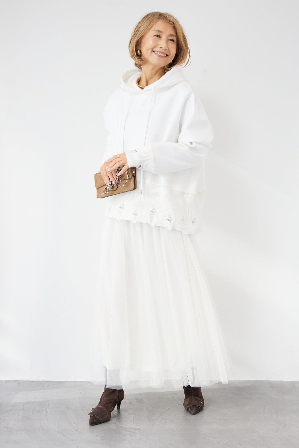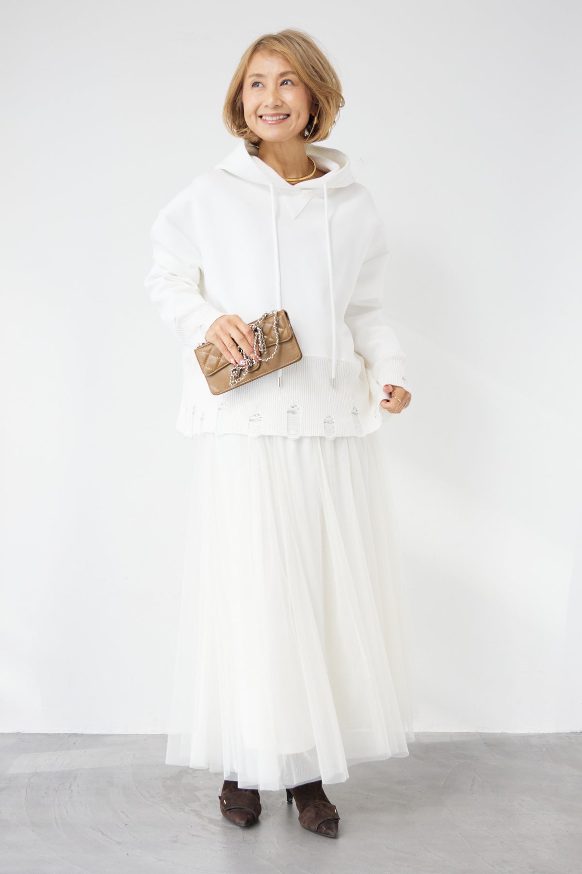 ダメージヘムデザインフーディ/チュールギャザースカート