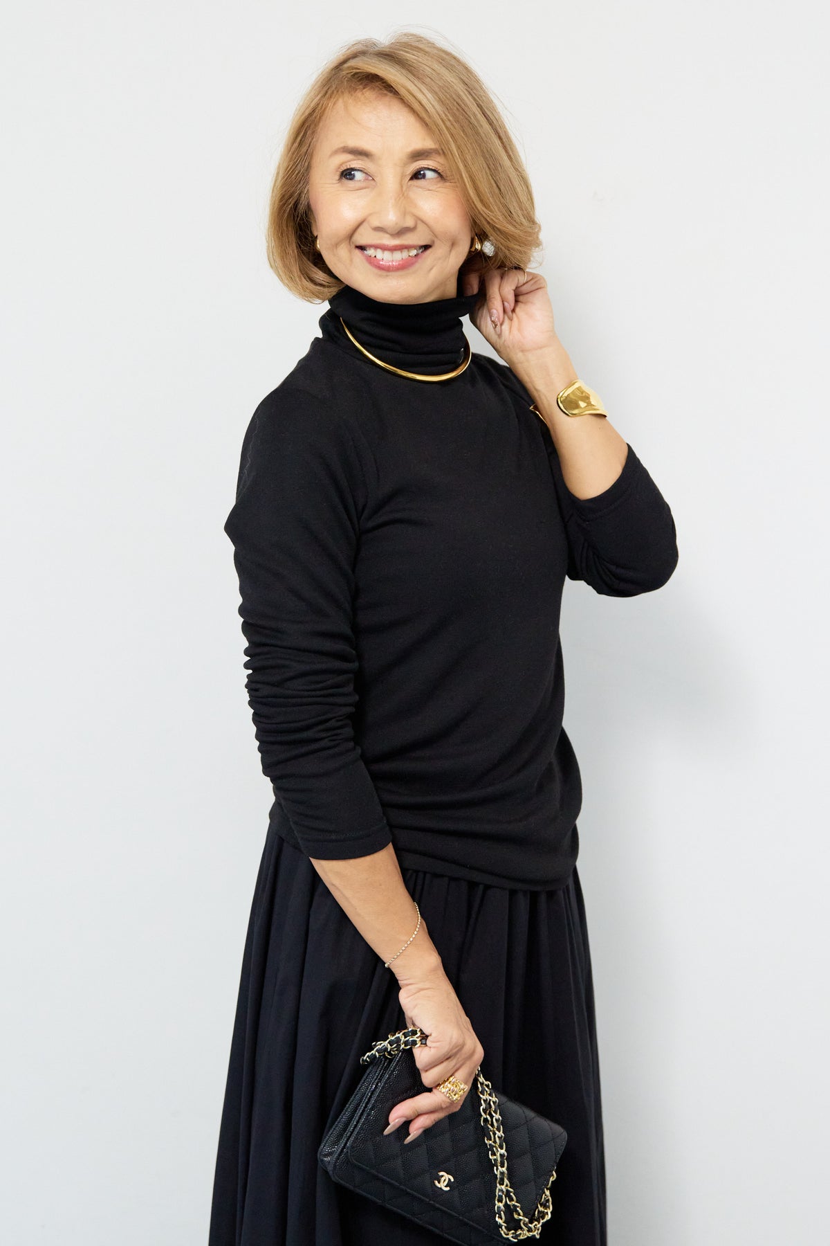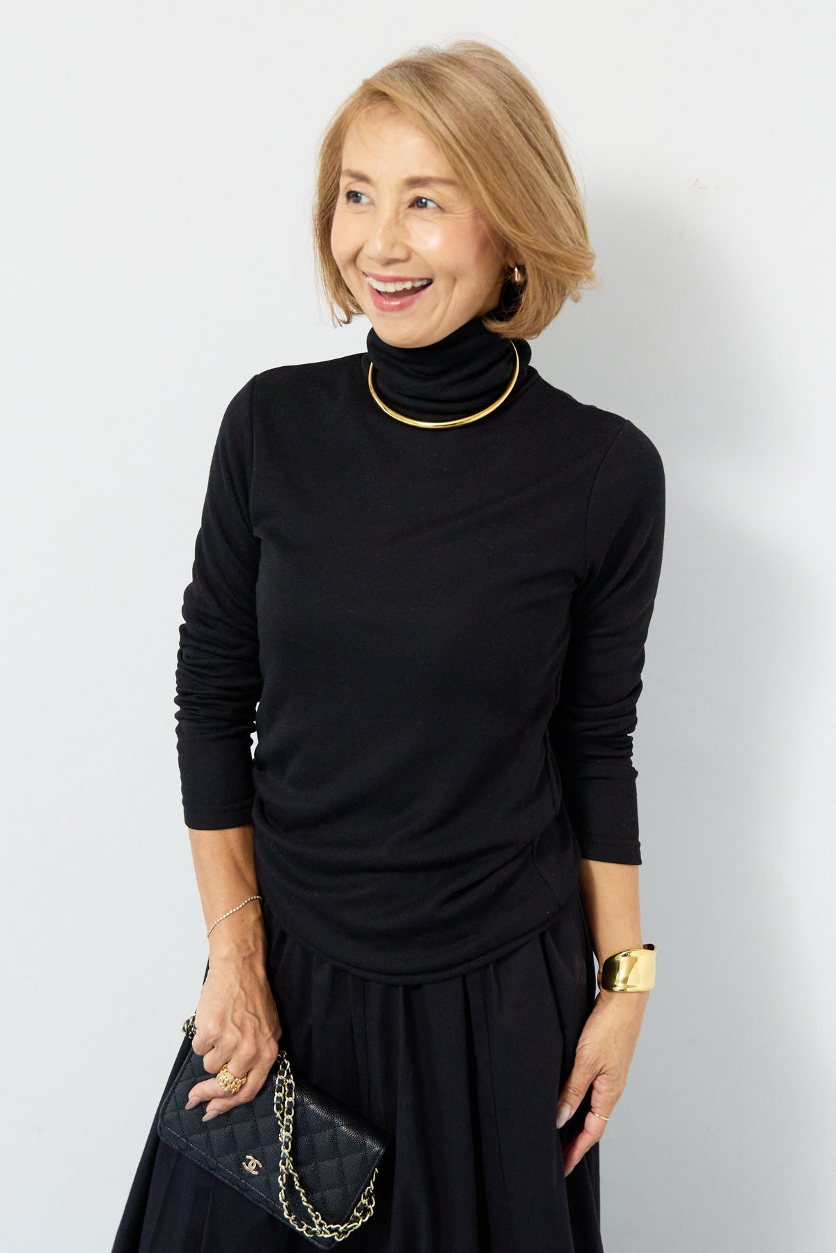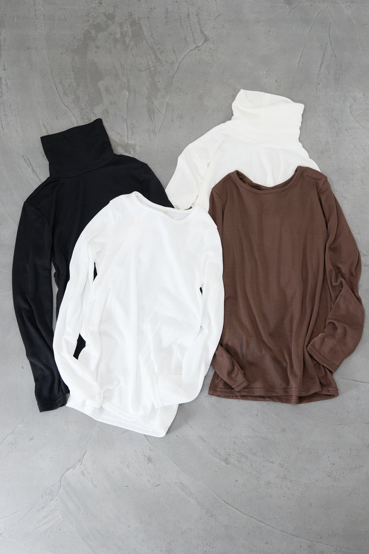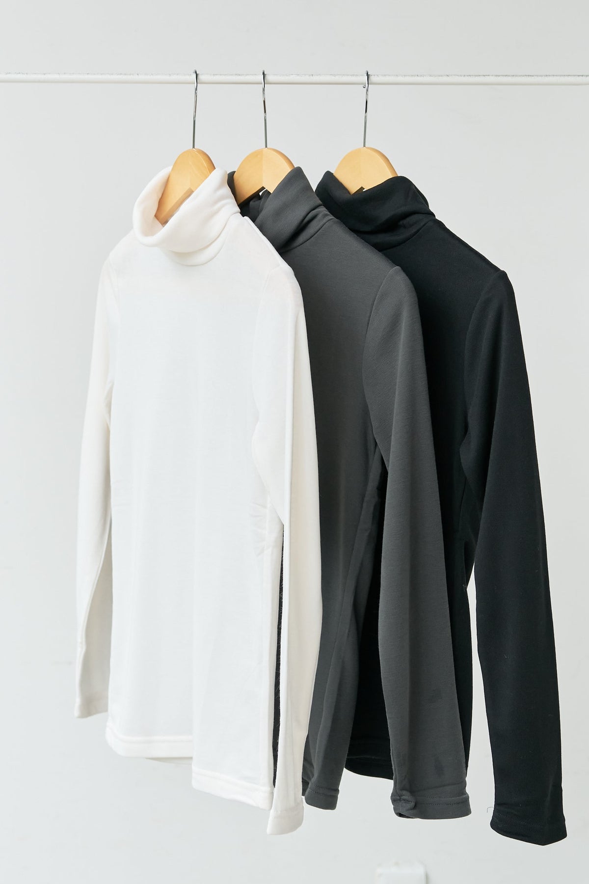 ひまわりオイル加工を施した生地を使用した肌触り抜群のタートルネック。ひまわりオイル加工の生地は肌に優しく、しっとりとした柔らかタッチ。ふんわりとした裏起毛は暖かく着心地抜群。着ぶくれしない厚すぎない生地感で1枚ではもちろん、インナーとしてもおすすめです。