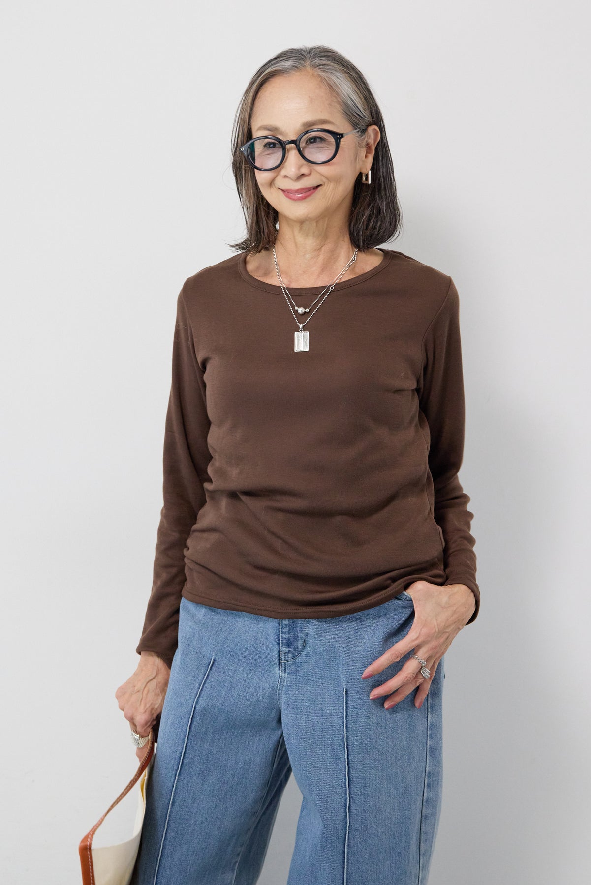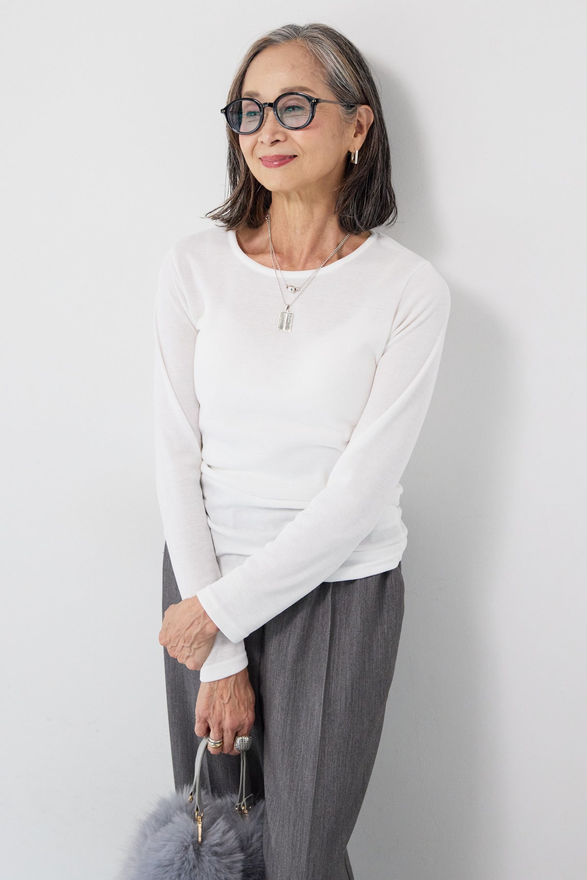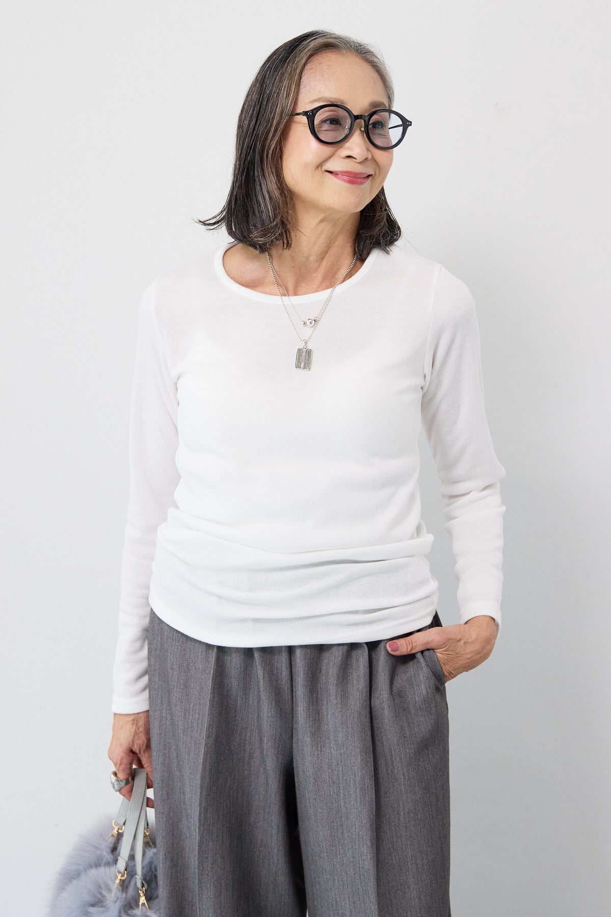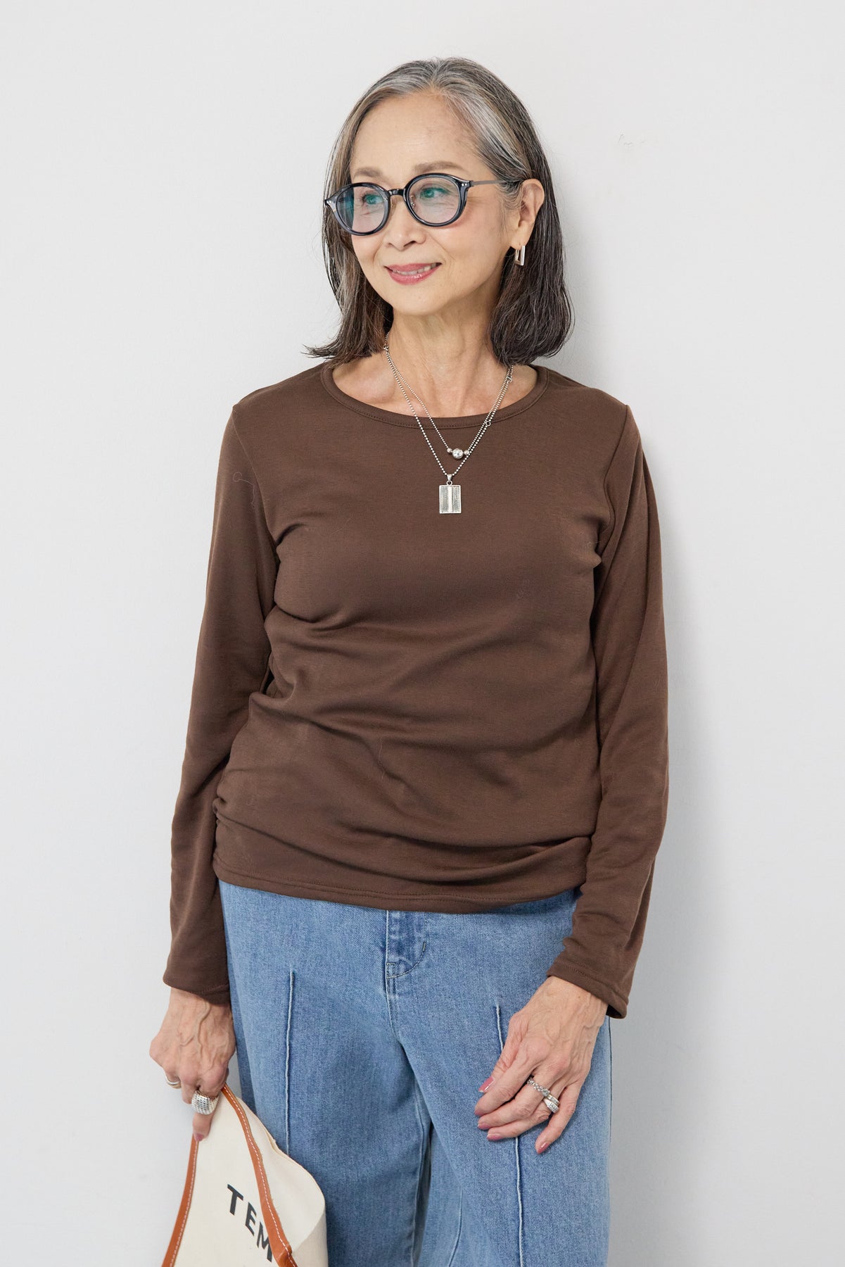 ひまわりオイル加工を施した生地を使用した肌触り抜群の長袖クルーネック。ひまわりオイル加工の生地は肌に優しく、しっとりとした柔らかタッチ。ふんわりとした裏起毛は暖かく着心地抜群。着ぶくれしない厚すぎない生地感で1枚ではもちろん、インナーとしてもおすすめです。