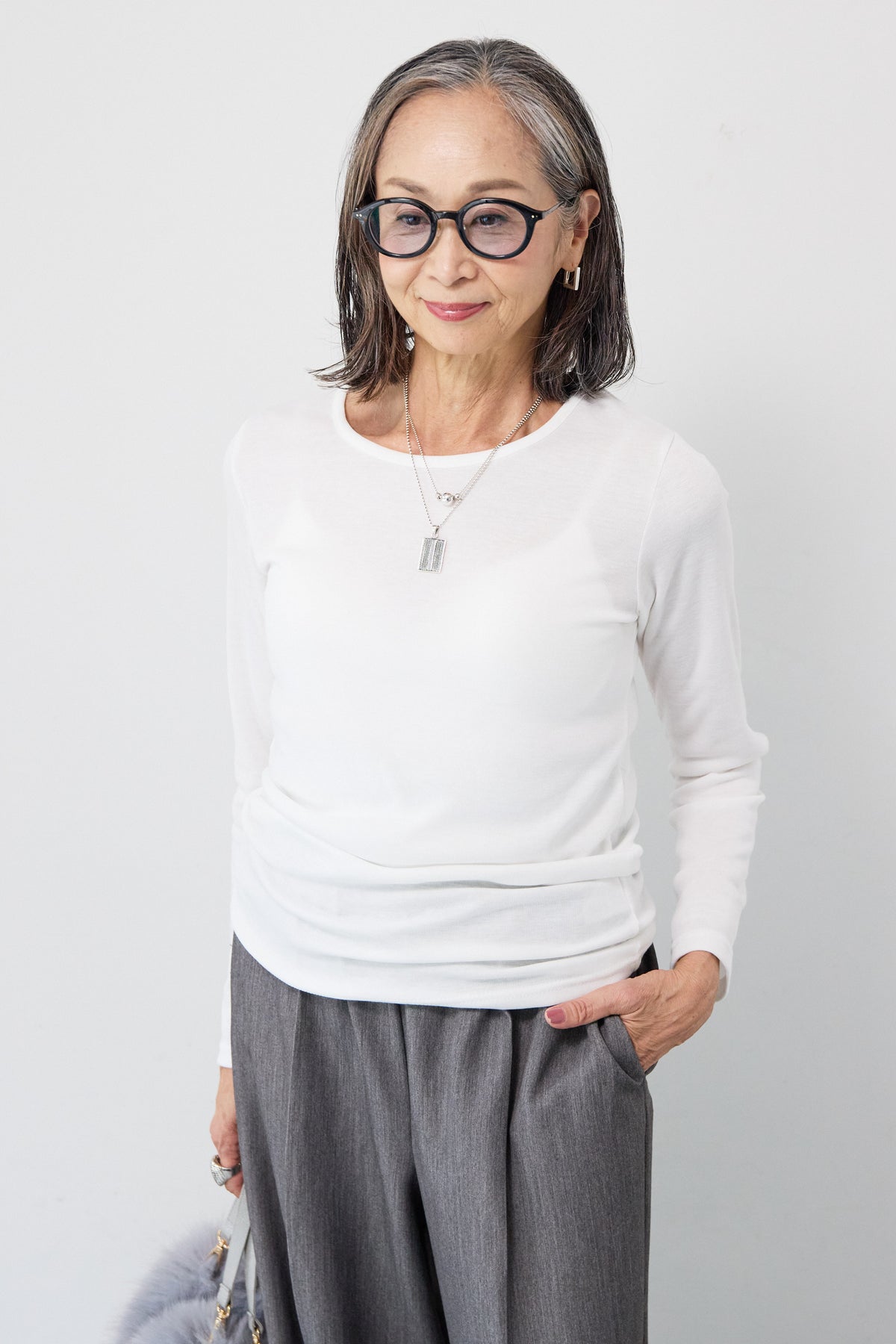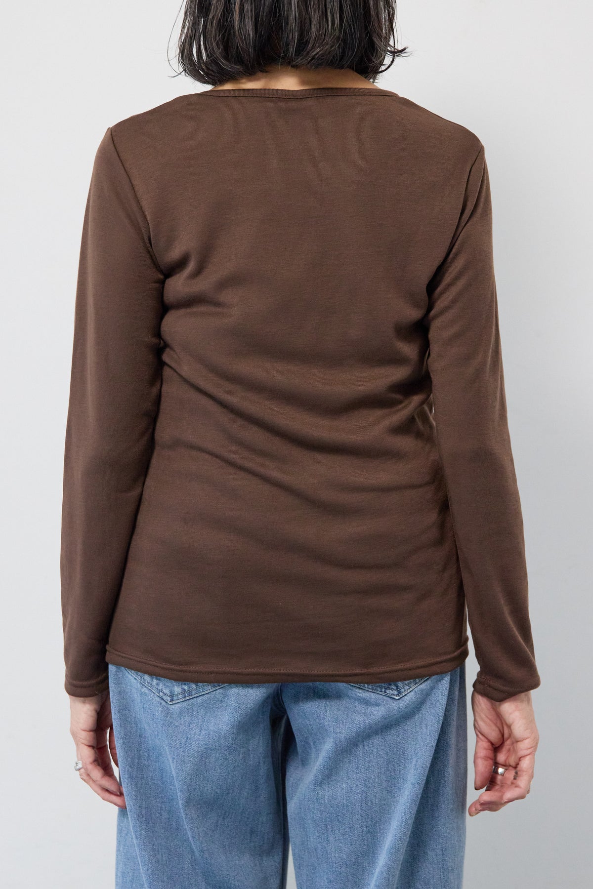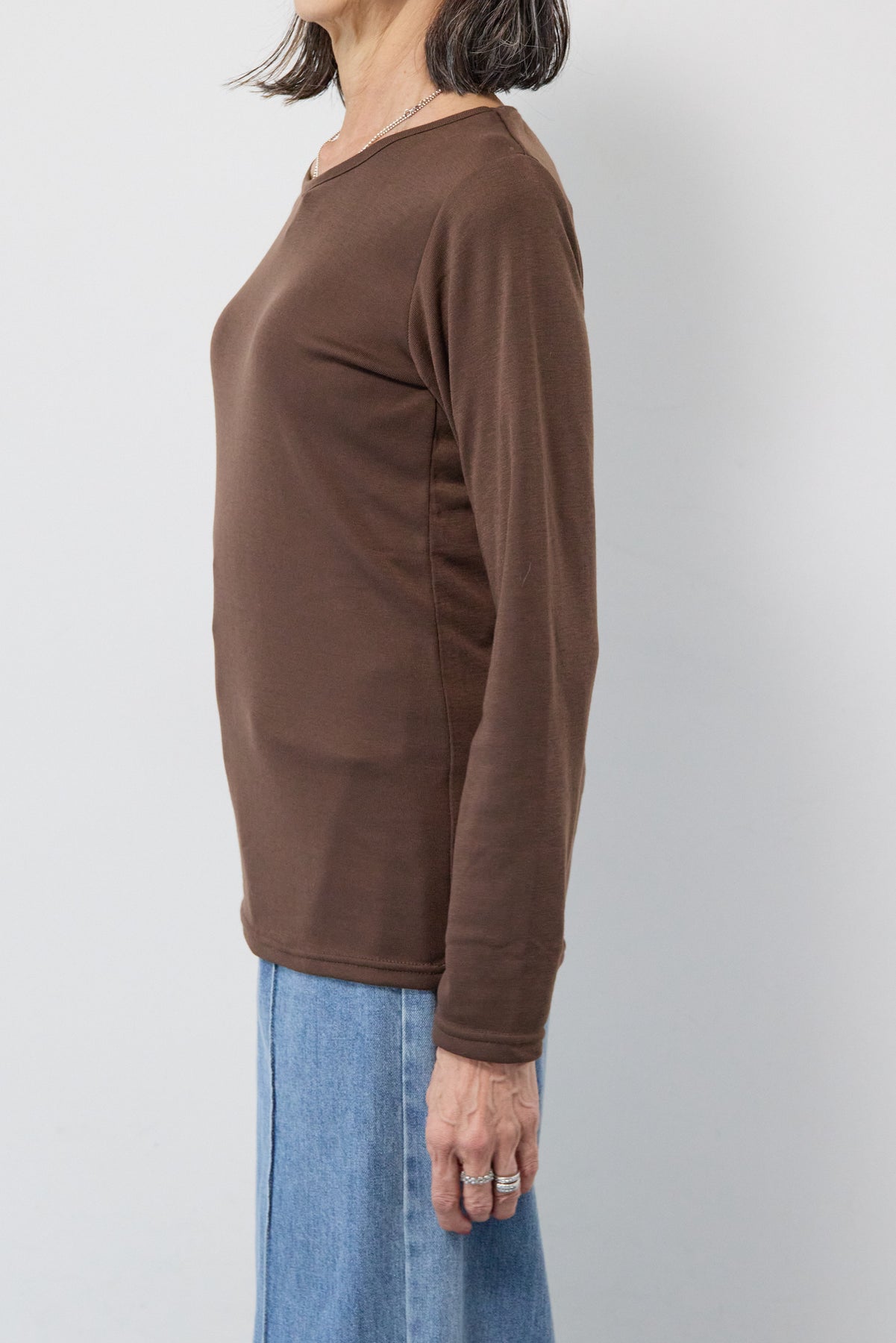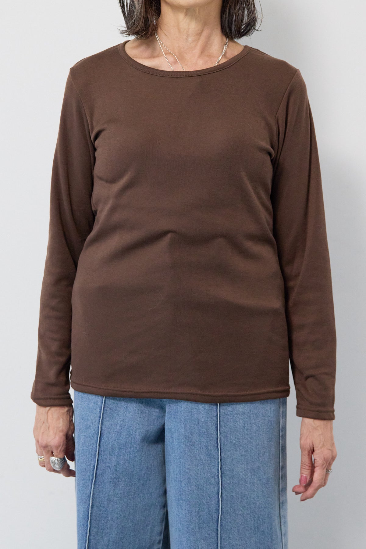 ひまわりオイル加工を施した生地を使用した肌触り抜群の長袖クルーネック。ひまわりオイル加工の生地は肌に優しく、しっとりとした柔らかタッチ。ふんわりとした裏起毛は暖かく着心地抜群。着ぶくれしない厚すぎない生地感で1枚ではもちろん、インナーとしてもおすすめです。